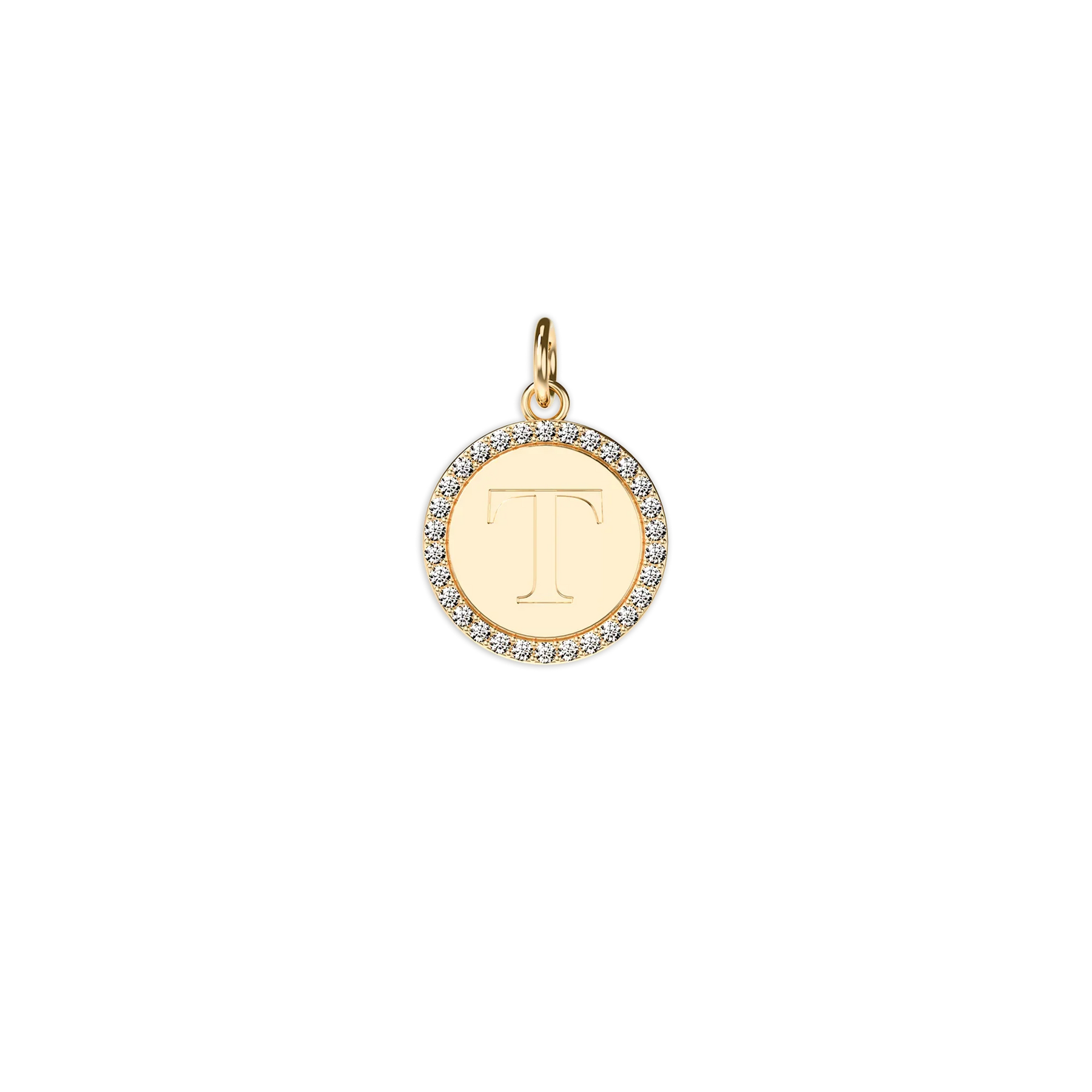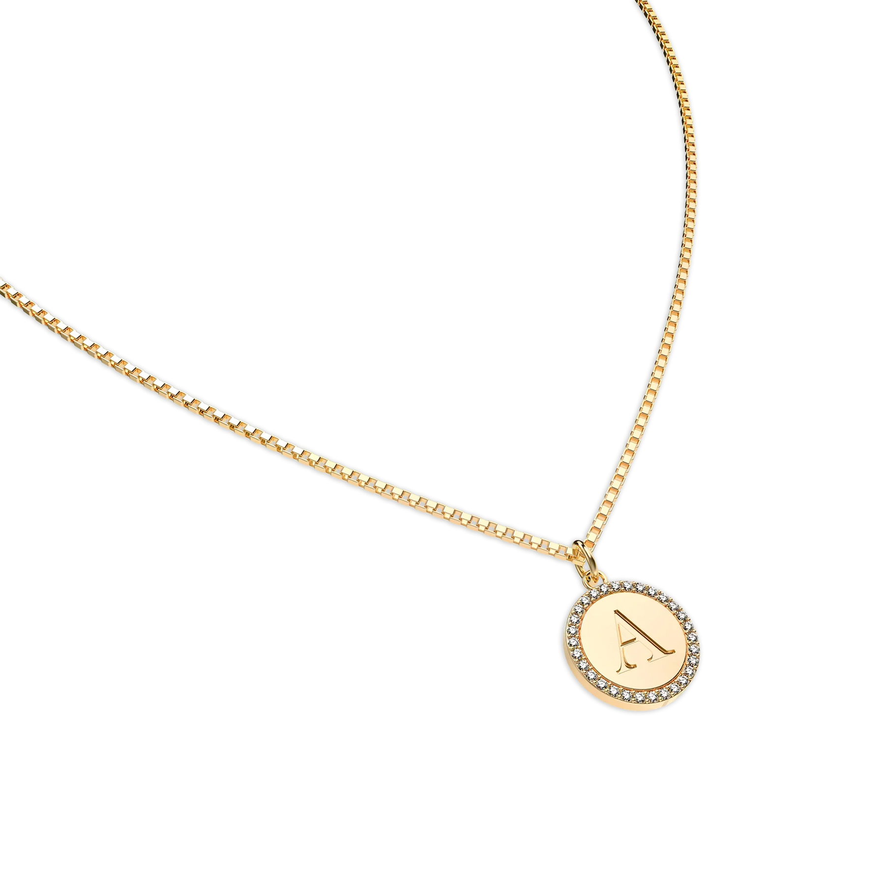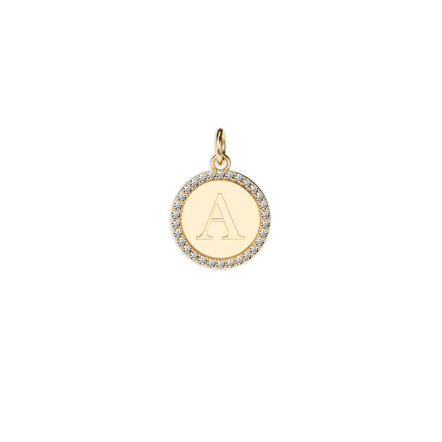 A circular alphabet pendant adorned with 30 lab-grown diamonds, emitting a radiant sparkle. The back can be engraved with desired content or names according to preferences, showcasing both personality and fashion taste.