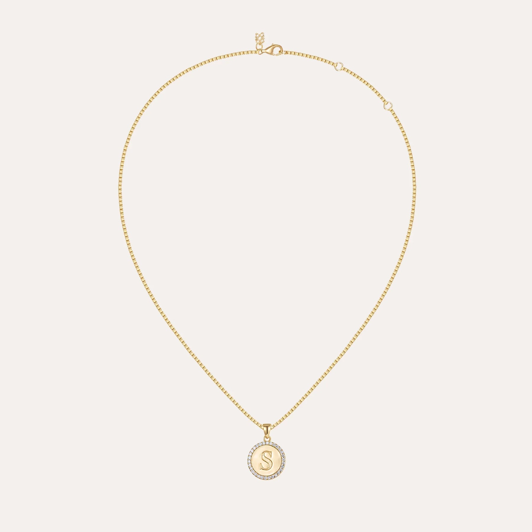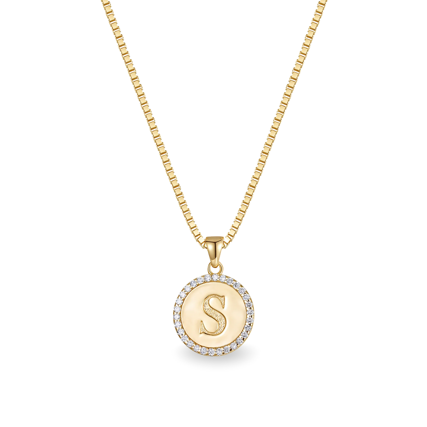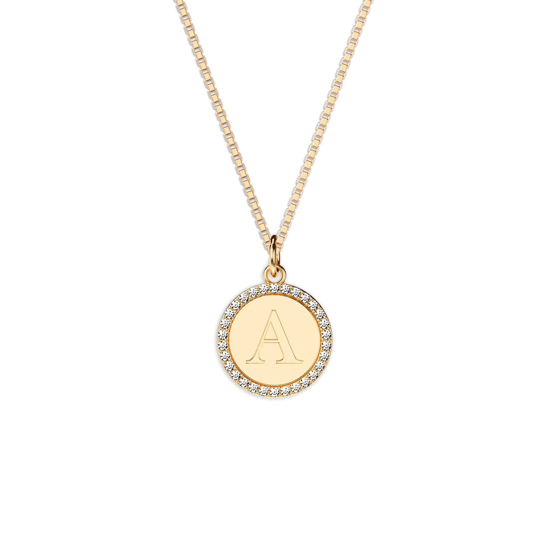 A circular alphabet pendant adorned with 30 lab-grown diamonds, emitting a radiant sparkle. The back can be engraved with desired content or names according to preferences, showcasing both personality and fashion taste.
