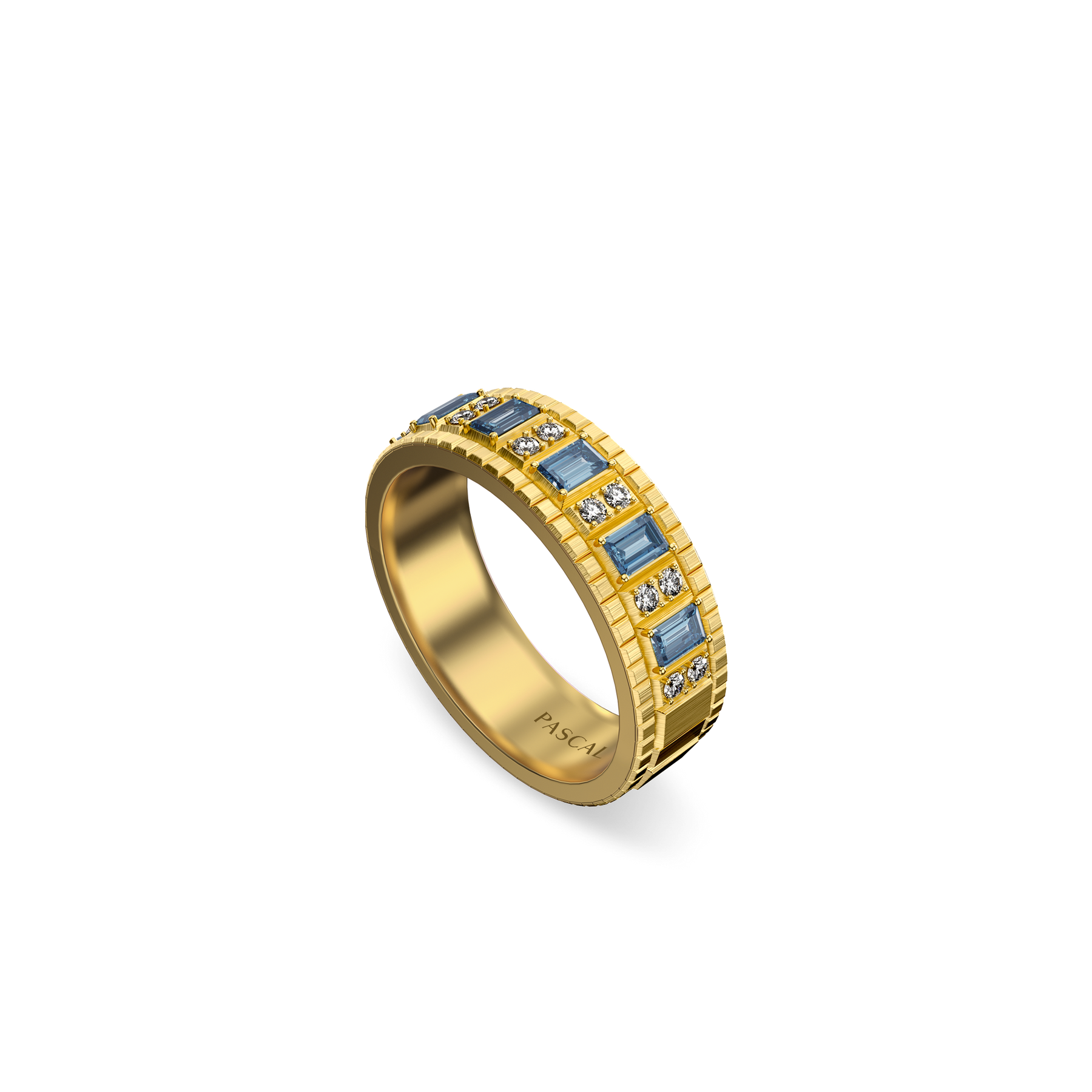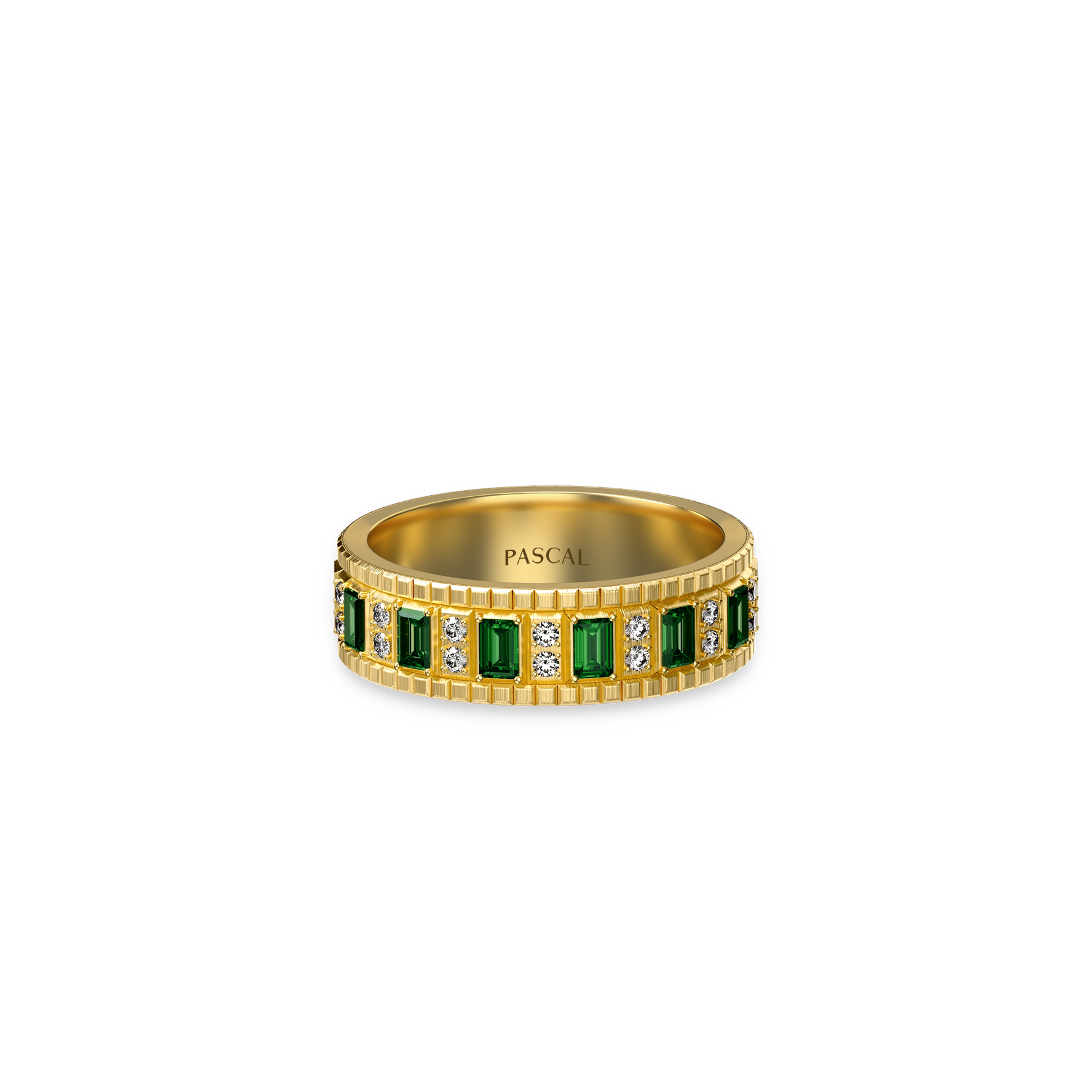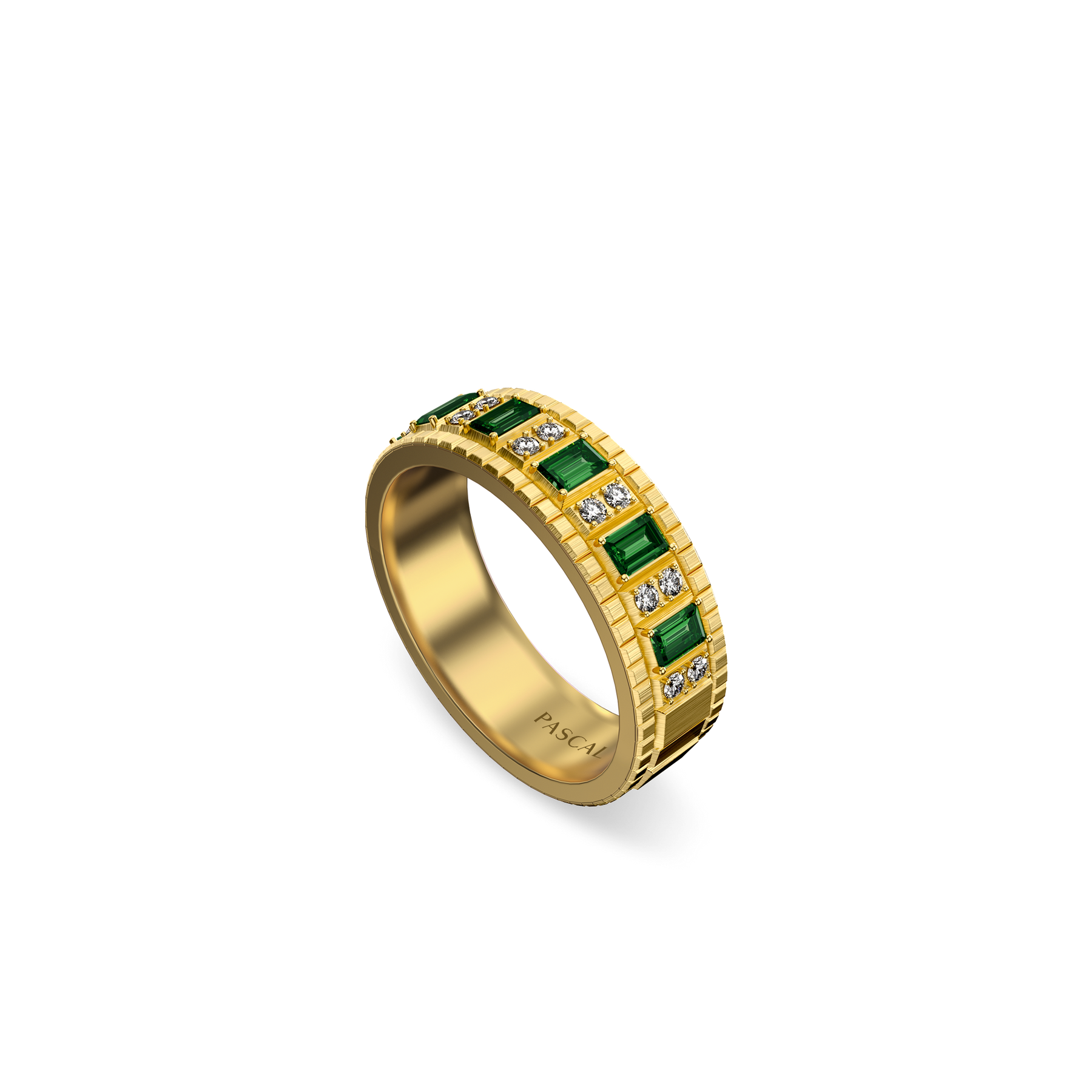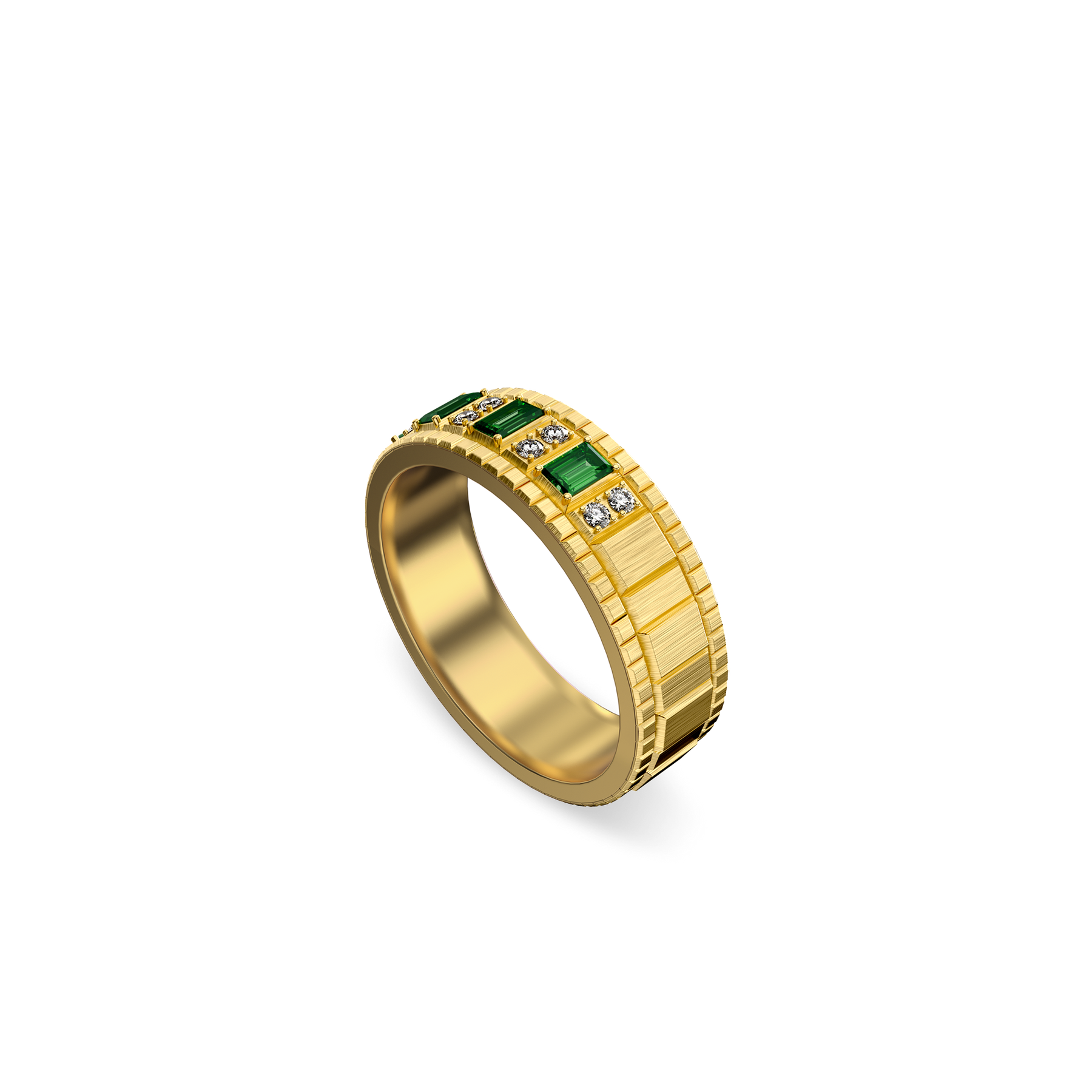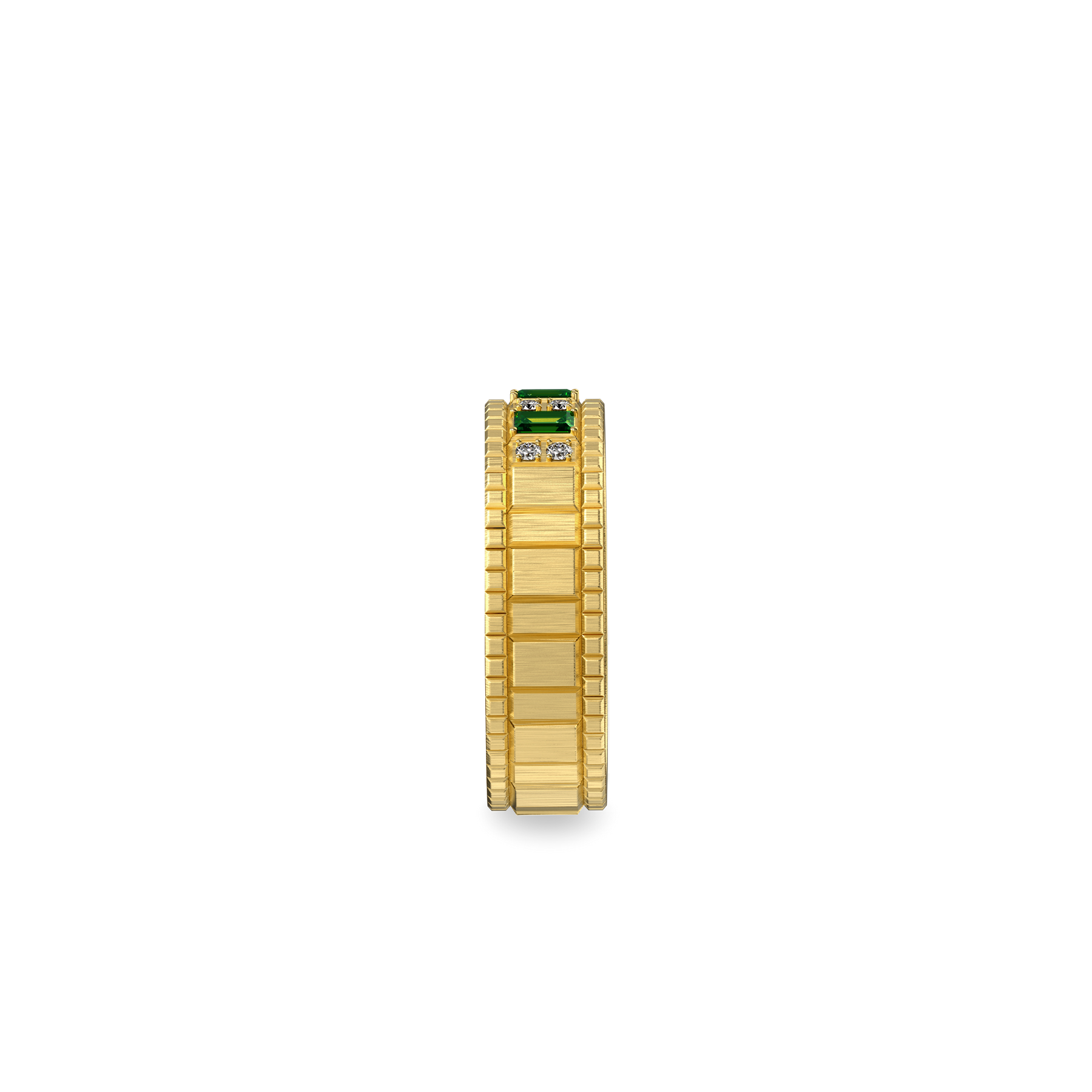 Rectangular gemstones read like notes cut into measured phrases, forming a clear modular sequence across the surface. Paired round diamonds punctuate the pattern like brief breaths and pauses, keeping the composition light within its order. As light skims over the segmented planes, it breaks into a regular play of highlights and shadows, shifting with each restrained turn.