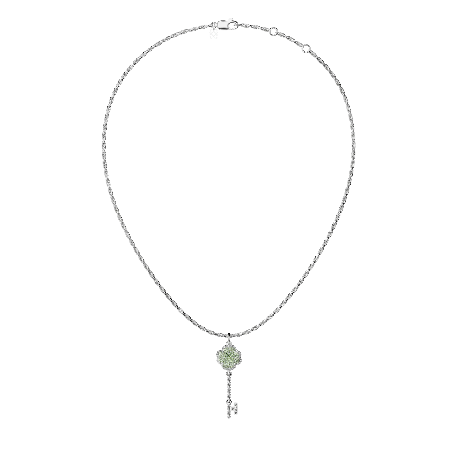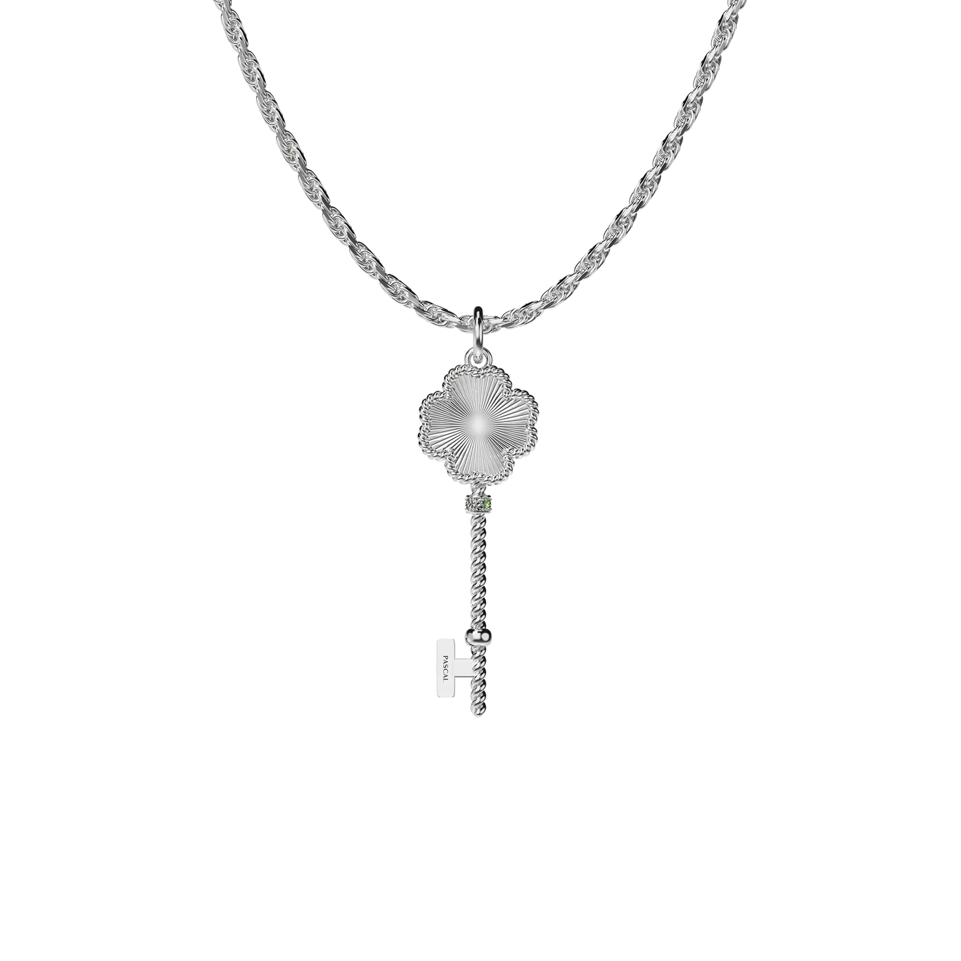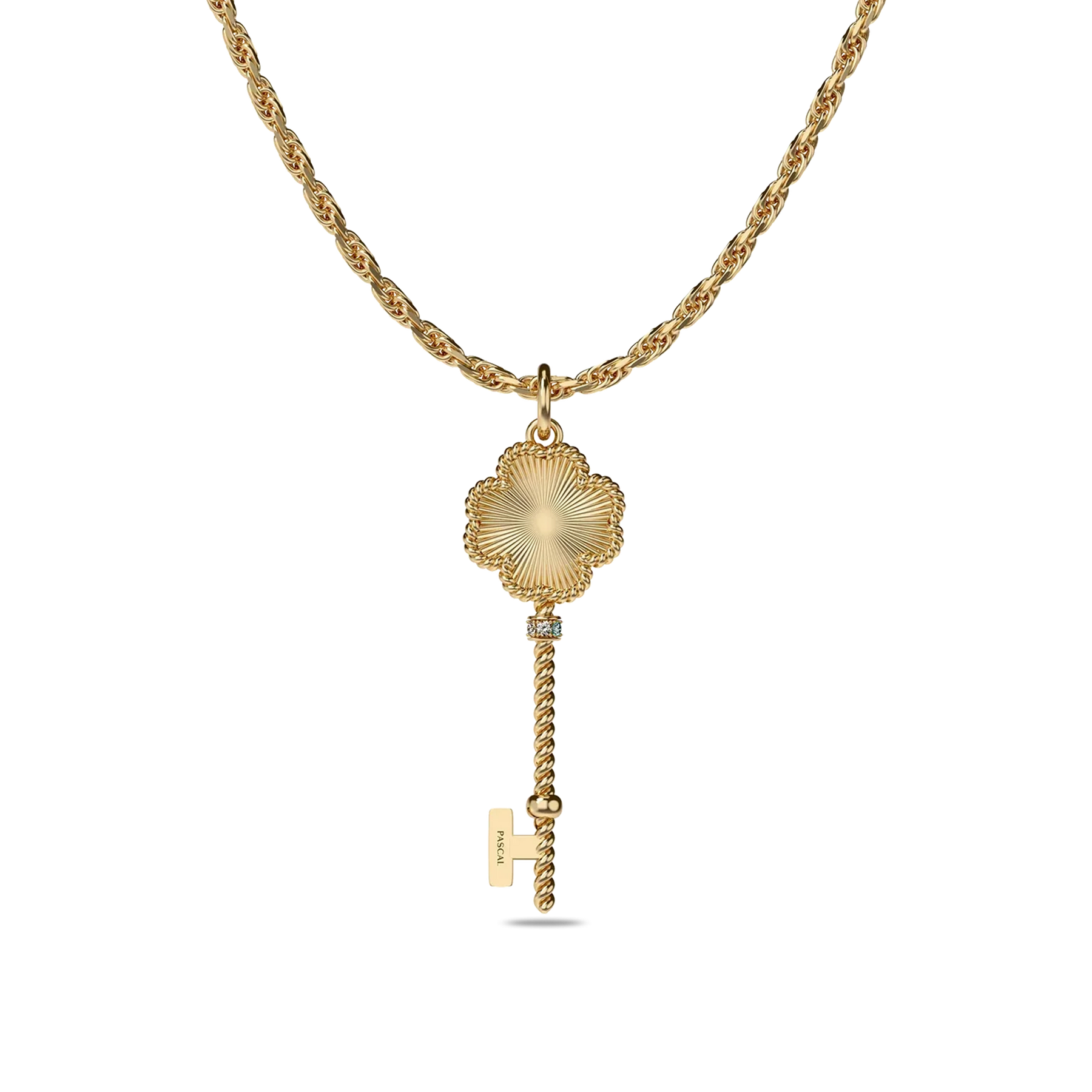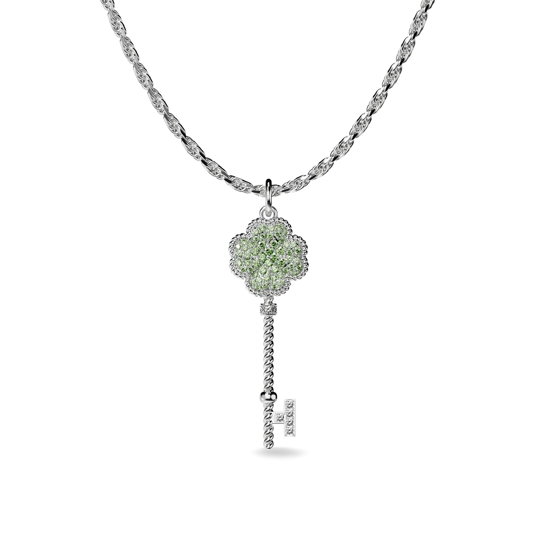 This vintage-inspired key pendant features a delicate four-leaf clover design adorned with 0.41 carats of white and PASCAL Eternal Green Diamonds. The clover is elegantly framed by a rope-style border, creating an antique charm that makes this piece both timeless and distinctive.