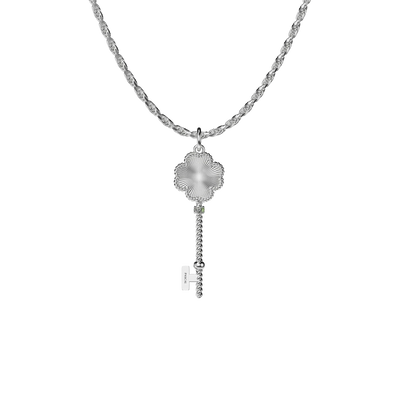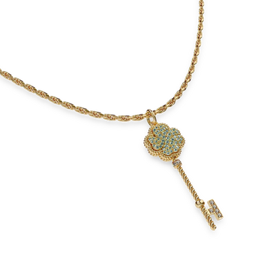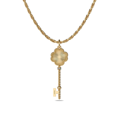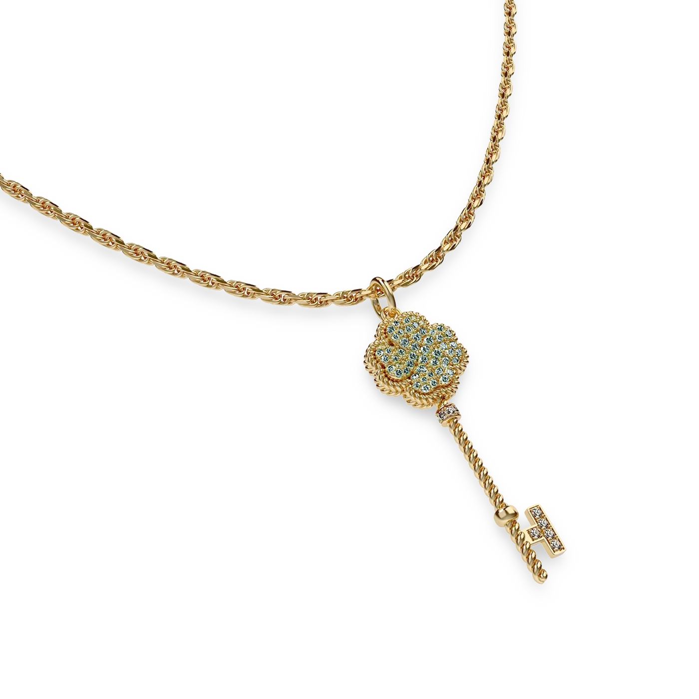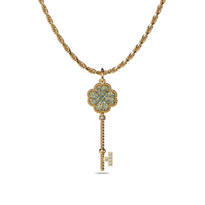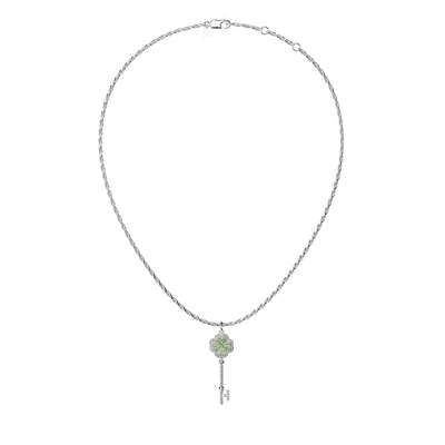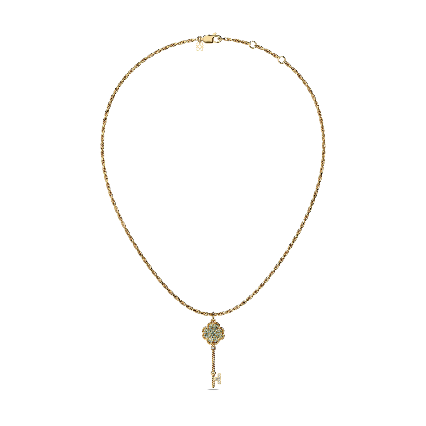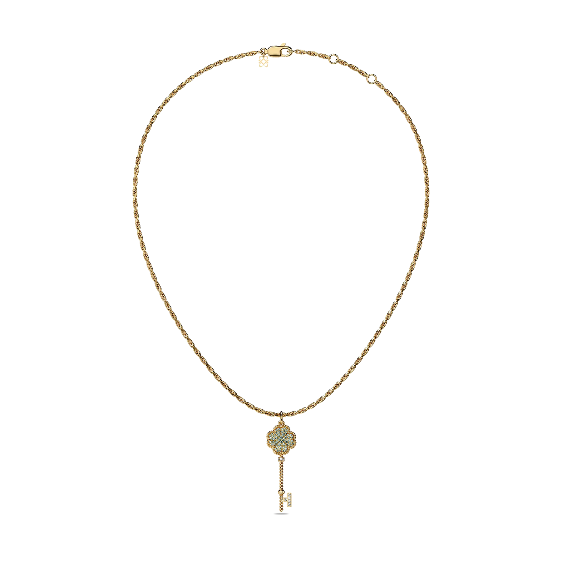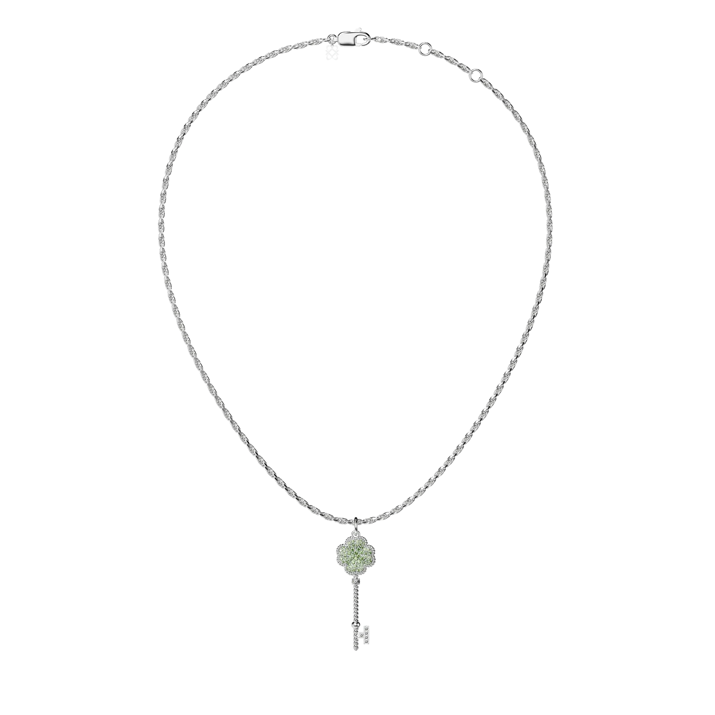 This vintage-inspired key pendant features a delicate four-leaf clover design adorned with 0.41 carats of white and PASCAL Eternal Green Diamonds. The clover is elegantly framed by a rope-style border, creating an antique charm that makes this piece both timeless and distinctive.