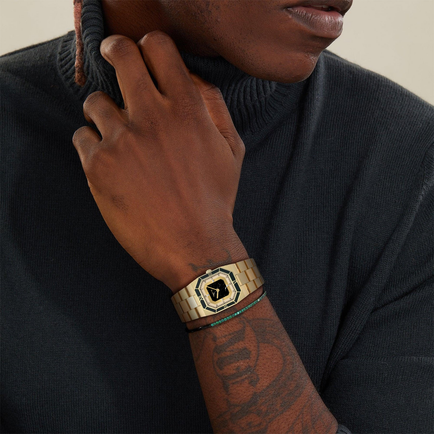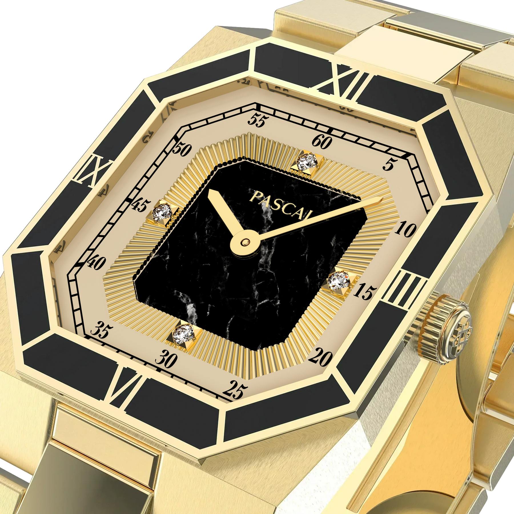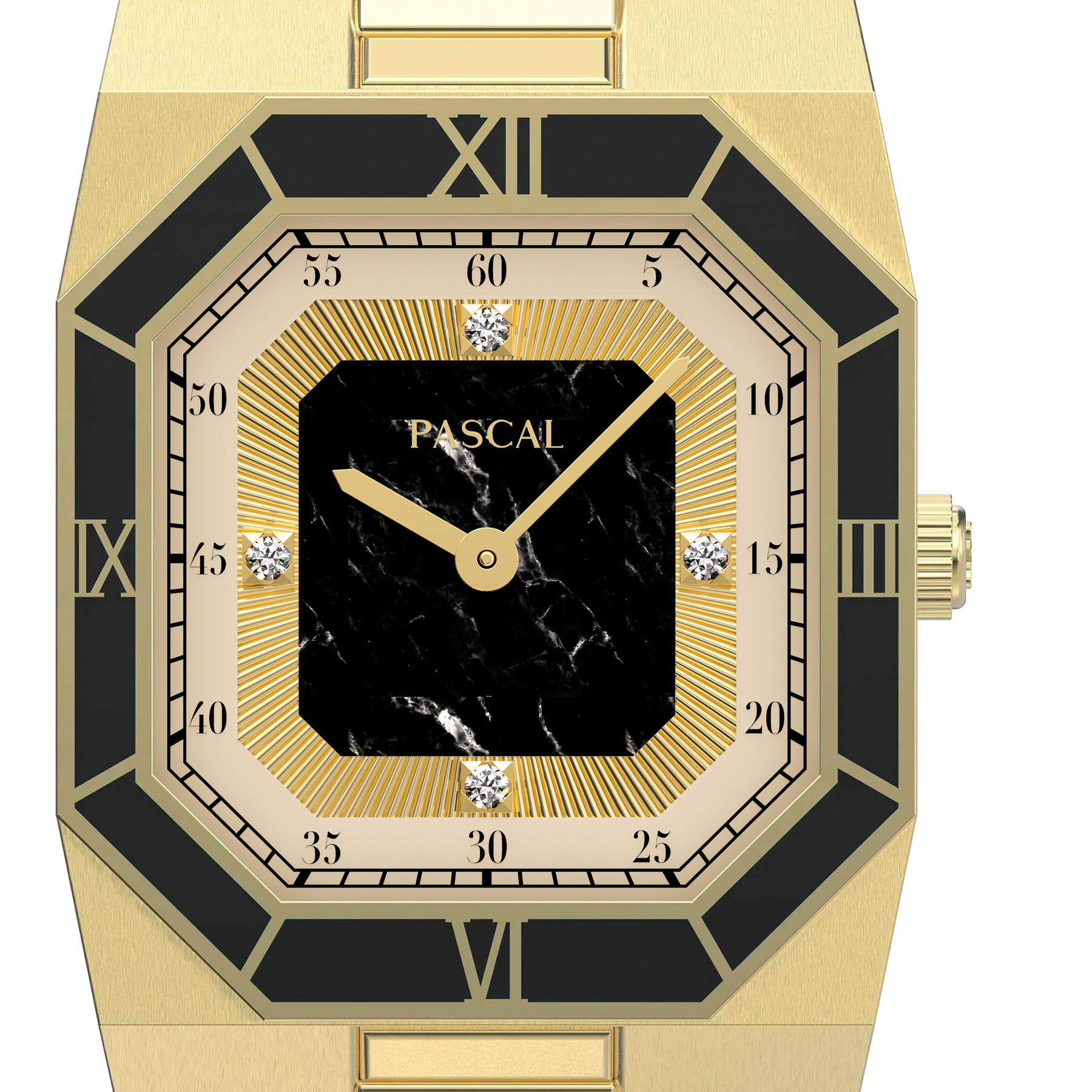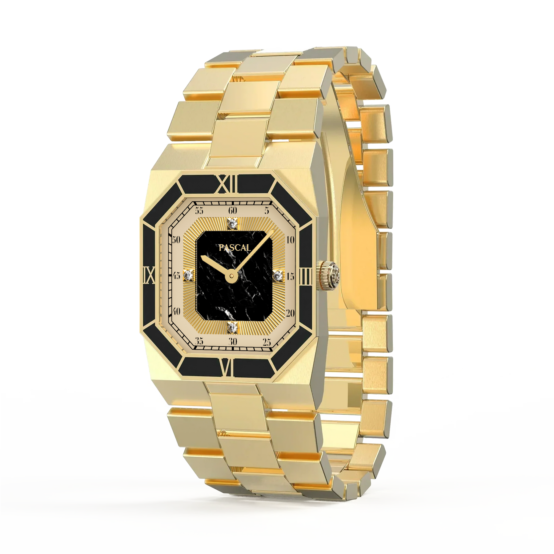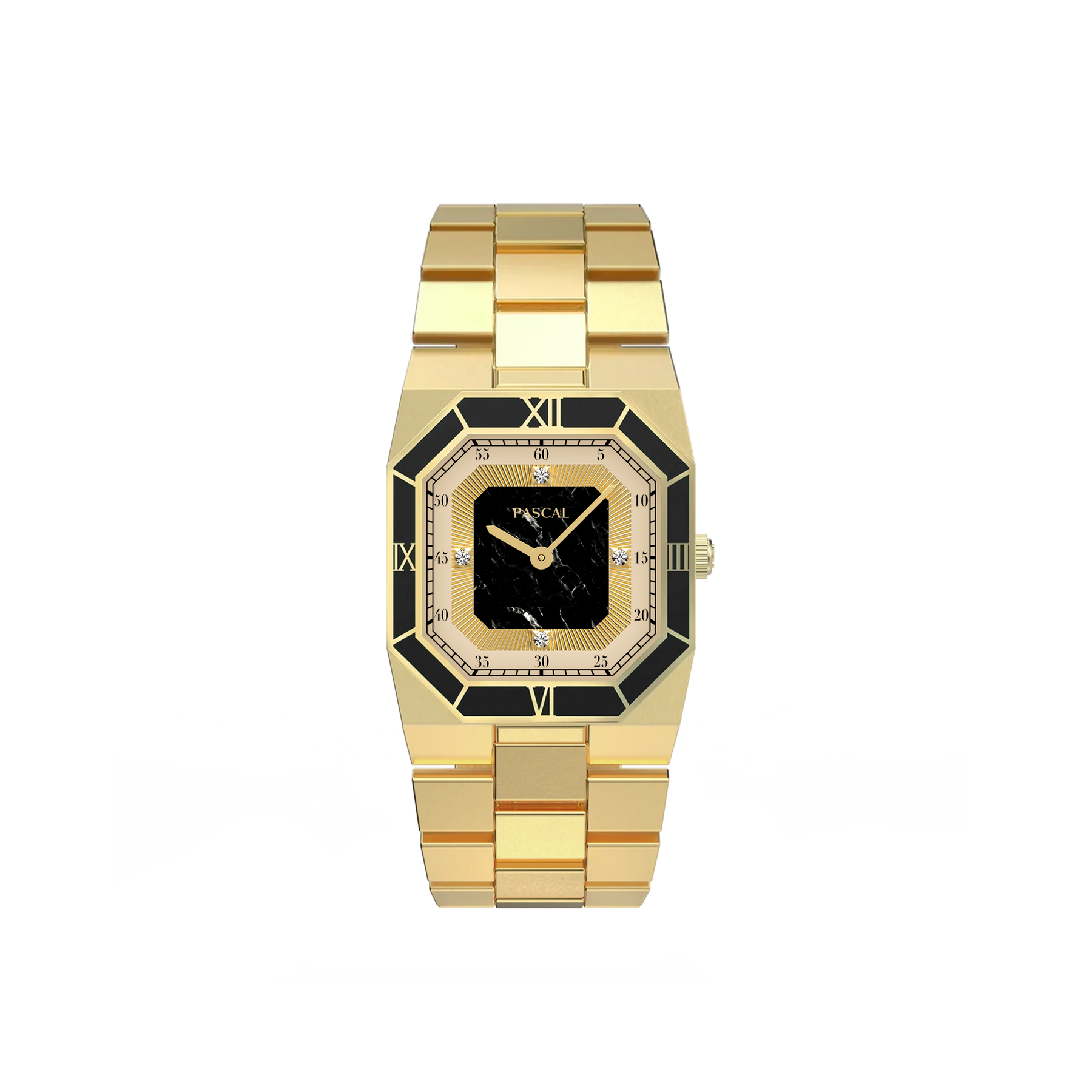 This distinguished timepiece features a meticulously designed dial and an enamel bezel with Roman numeral markers. The entire body is gold-colored, with an octagonal case that draws inspiration from vintage elements. Enhanced with lab-grown diamonds, this watch bridges past and present, celebrating timeless design with a modern twist.