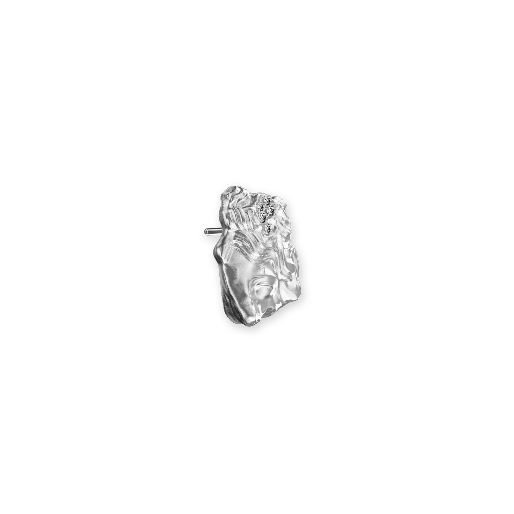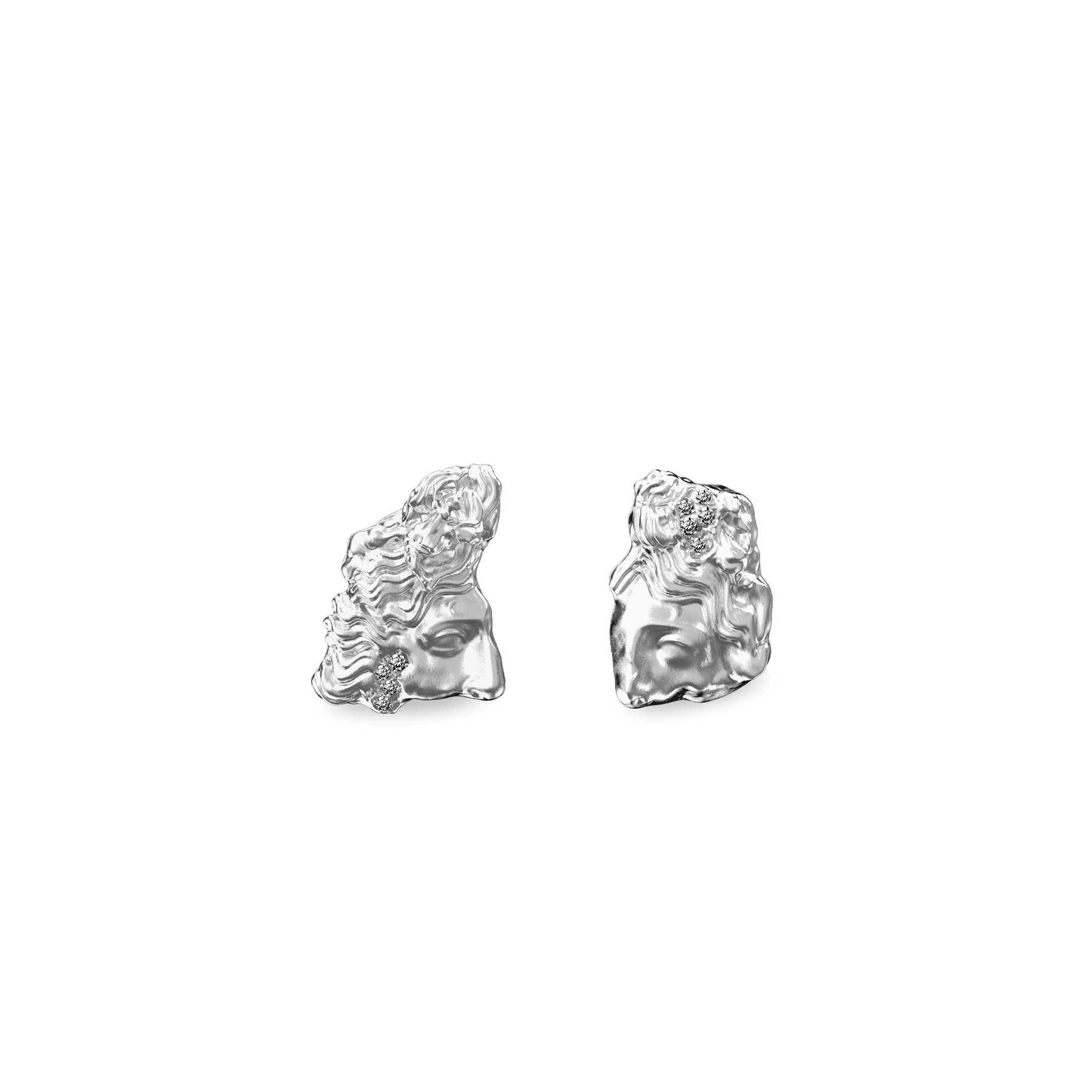Unlike flawless statues, the design intentionally preserves traces of time-worn imperfection, evoking the aura of an ancient relic weathered by centuries. The complete sculpture is reimagined as two asymmetrical earrings, where brilliant lab-grown diamonds are set into the cracks and voids. Their radiance emerges from the fractures, symbolizing rebirth through imperfection, like the dawn and hope brought forth by Apollo.