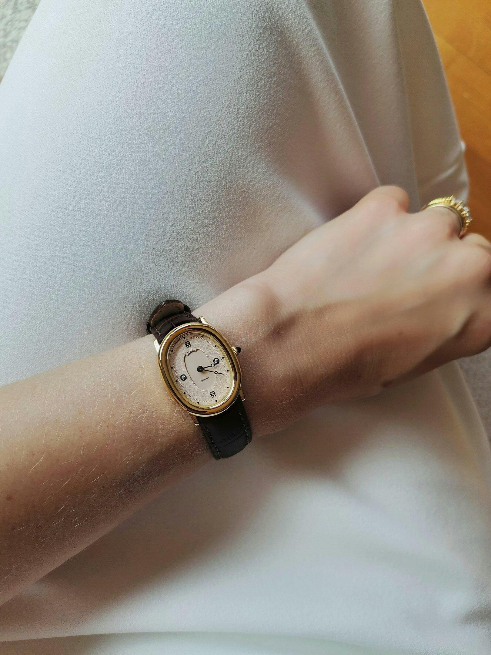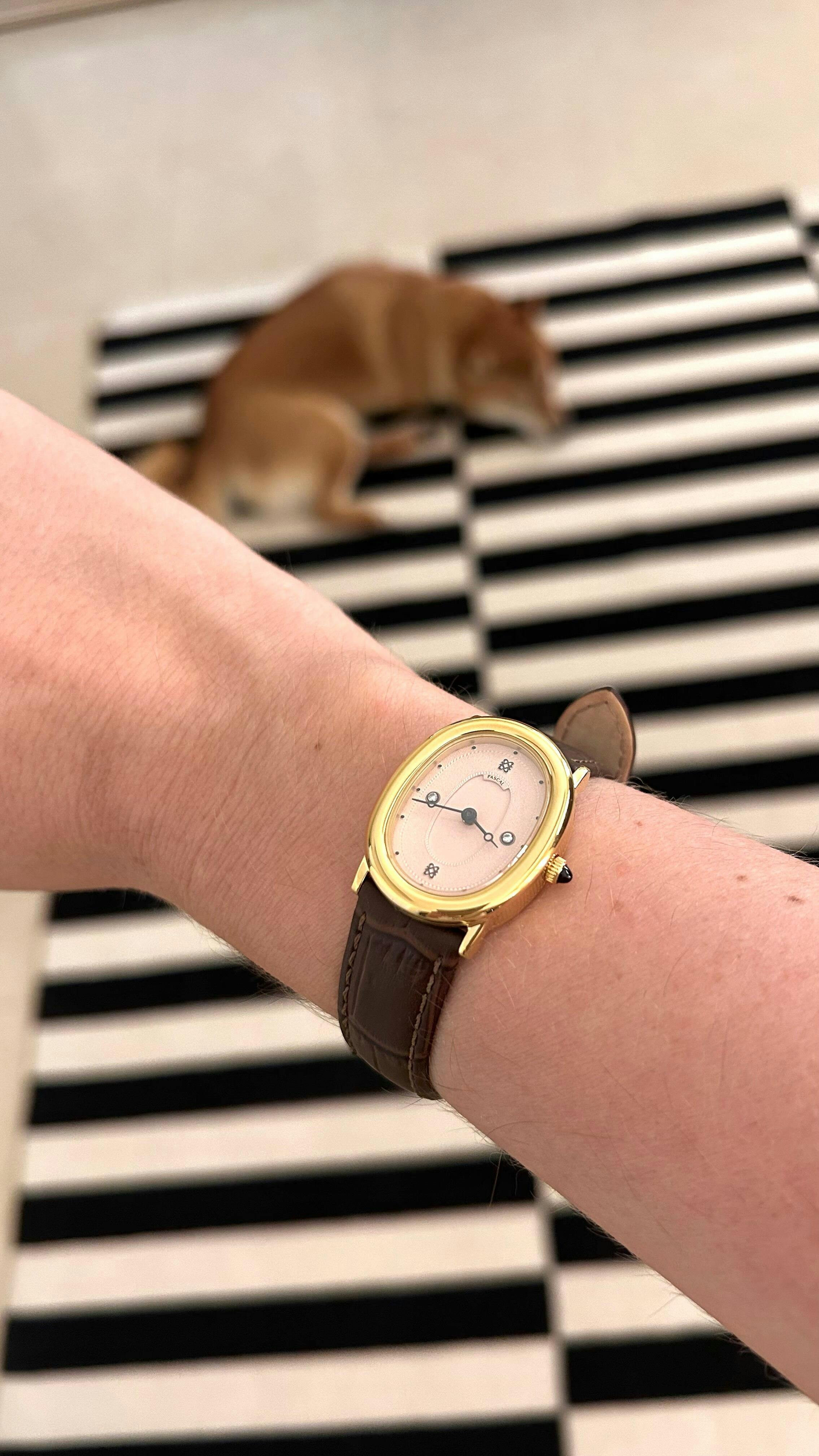 With an oval-shaped dial and an expanding bezel akin to a tempting doughnut, this timepiece is truly captivating. The dual-layered dial is uniquely tinted in a classic salmon hue, embodying the traces of time as it gracefully flows. Shimmering diamonds replace the 3 and 9 o'clock markers. Paired with an elegant brown strap featuring crocodile textures, the overall design exudes understated nobility.