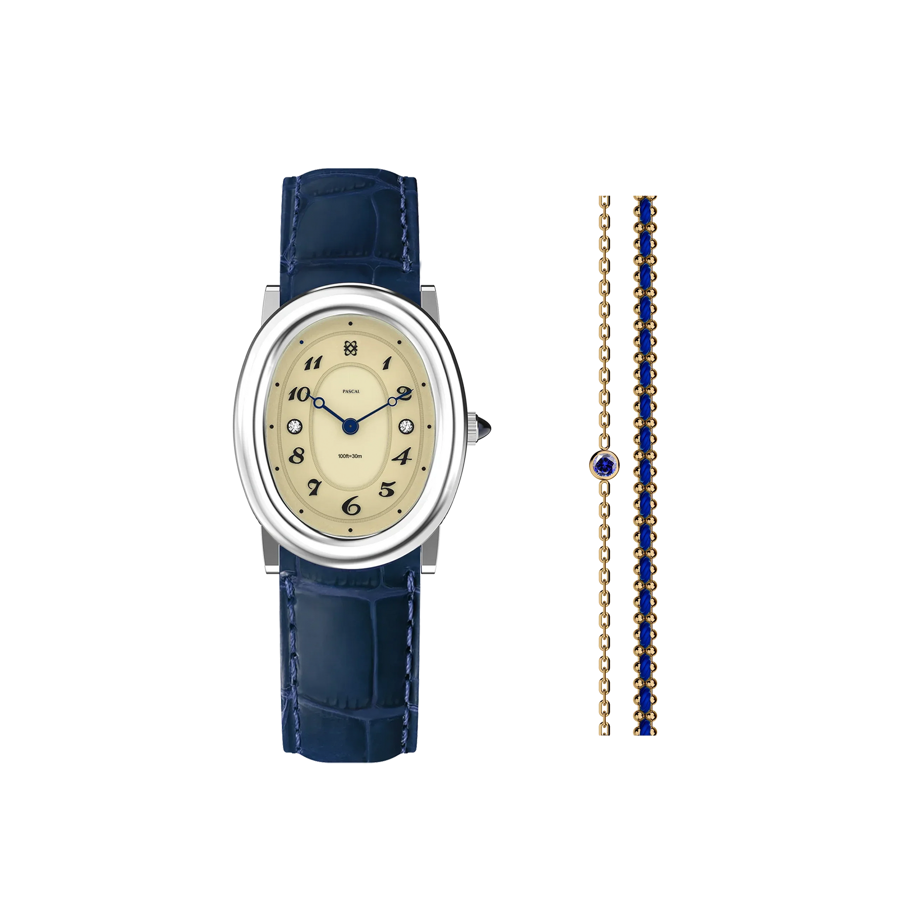 This vintage-inspired watch features a creamy latte-colored dial with elegantly depicted hour markers. Dark blue hands emit a mysterious glow against the backdrop. Paired with an elegant alligator-textured leather strap, the silver steel case complements the matte blue leather strap. Elegance withstands the test of time.