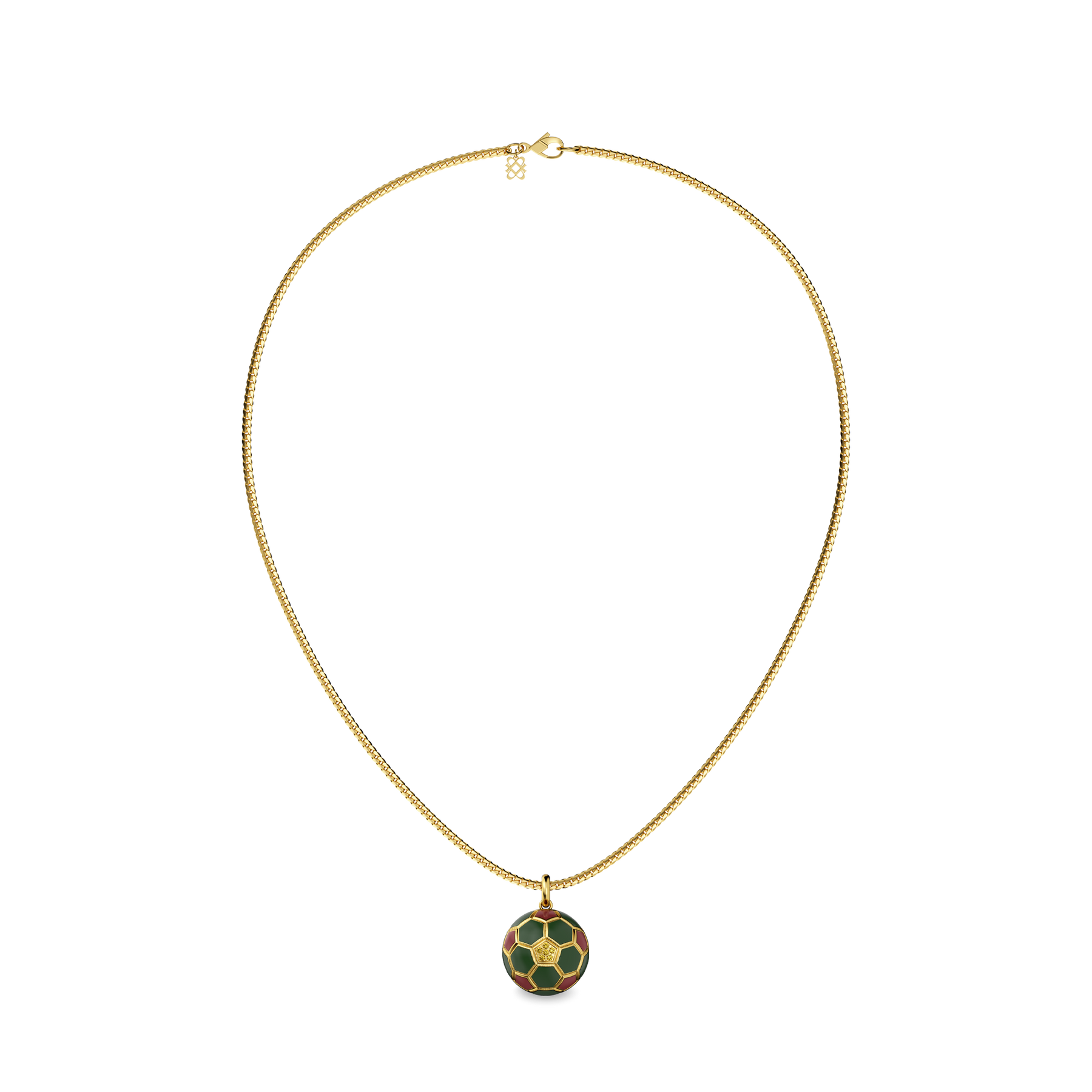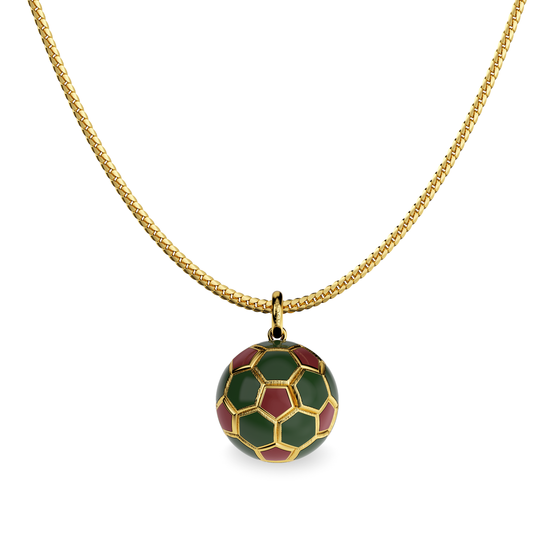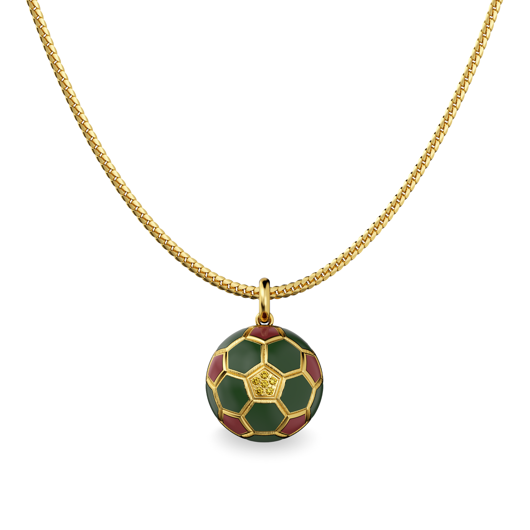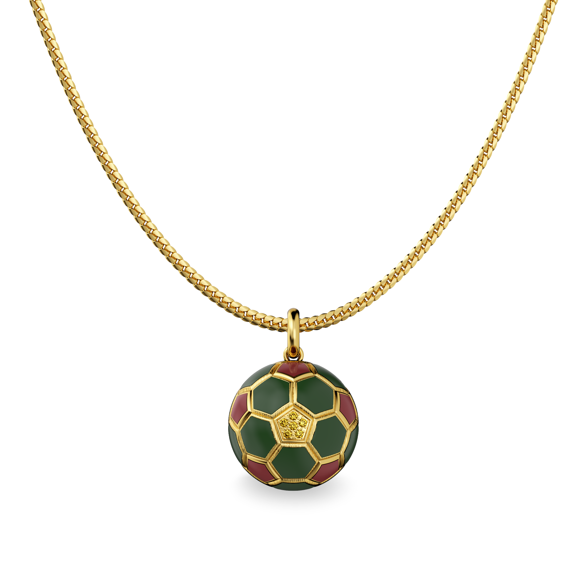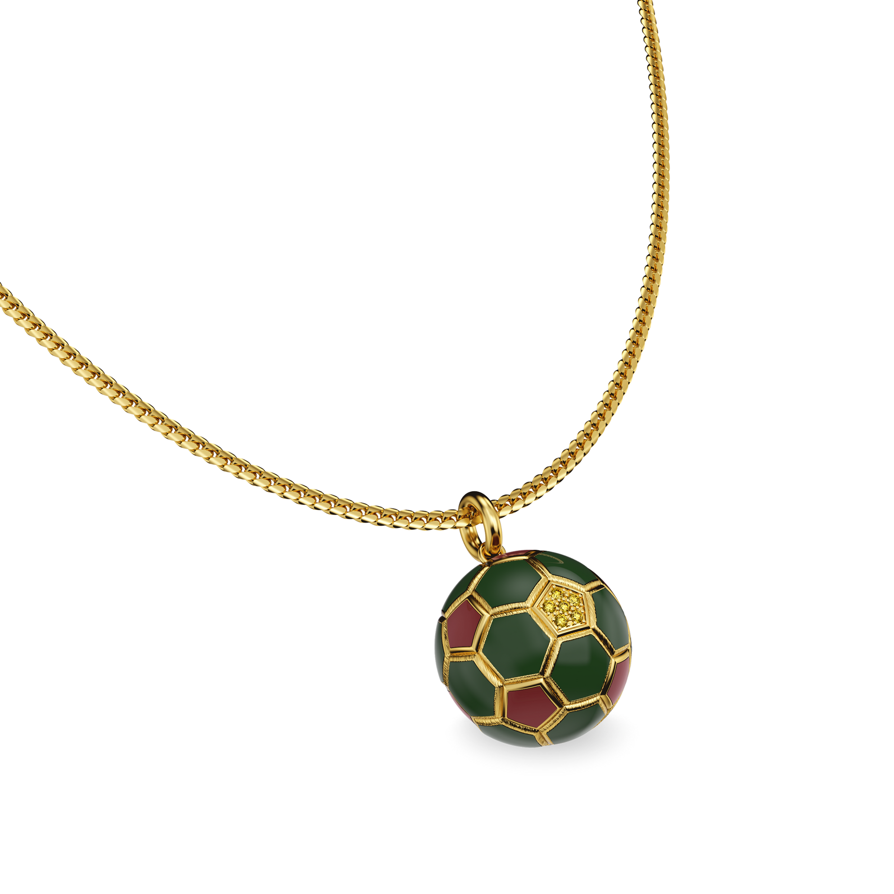 Crafted as a fully three-dimensional sphere, the pendant features deep green and wine-red enamel hexagons arranged across its surface—capturing the rhythm of the Moroccan jersey in a miniature golden form. At its center, a hexagonal setting holds a lab-grown yellow diamond, reminiscent of a lion’s golden eye—symbolizing vision, focus, and those decisive moments that change the game.