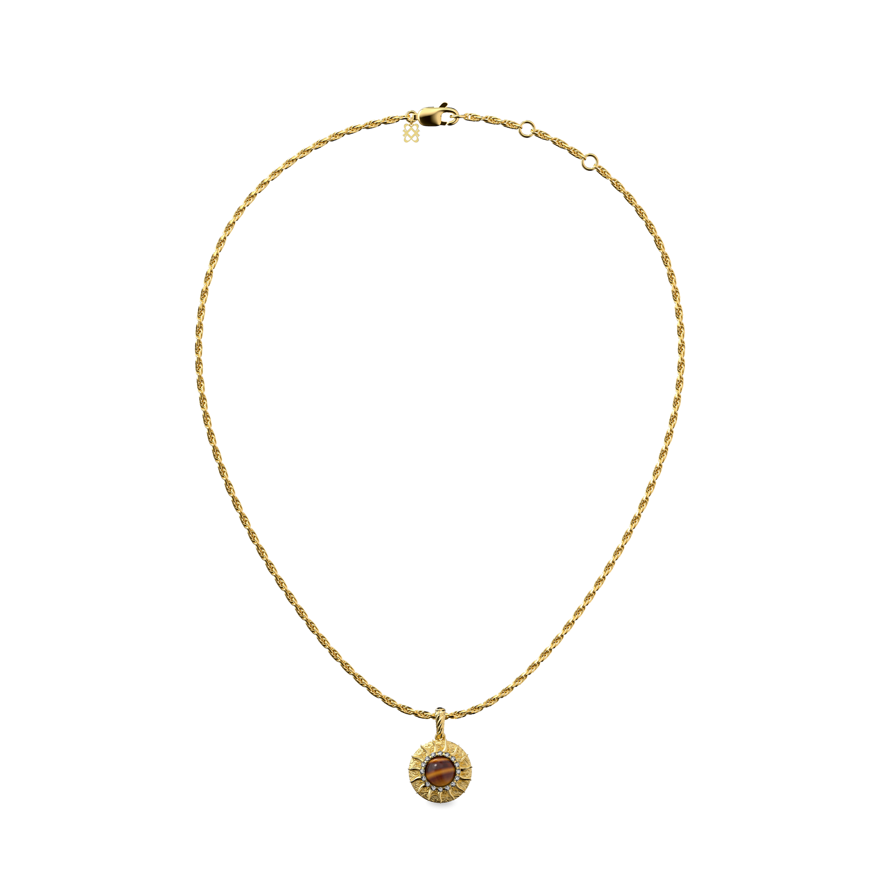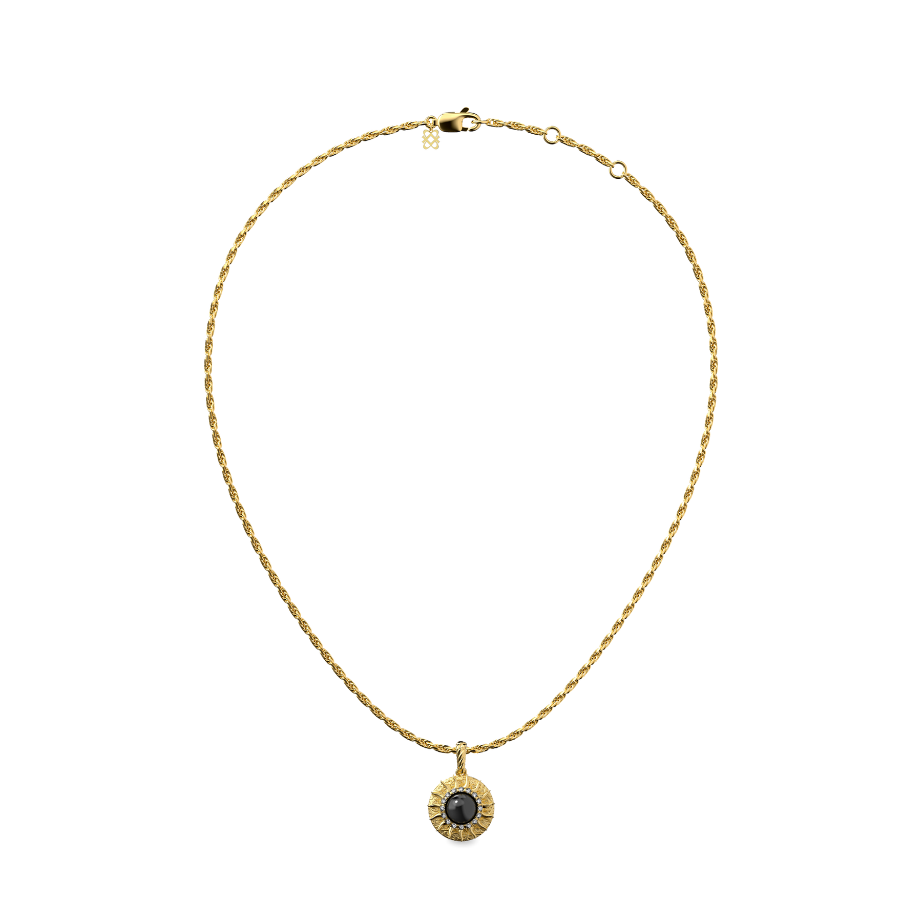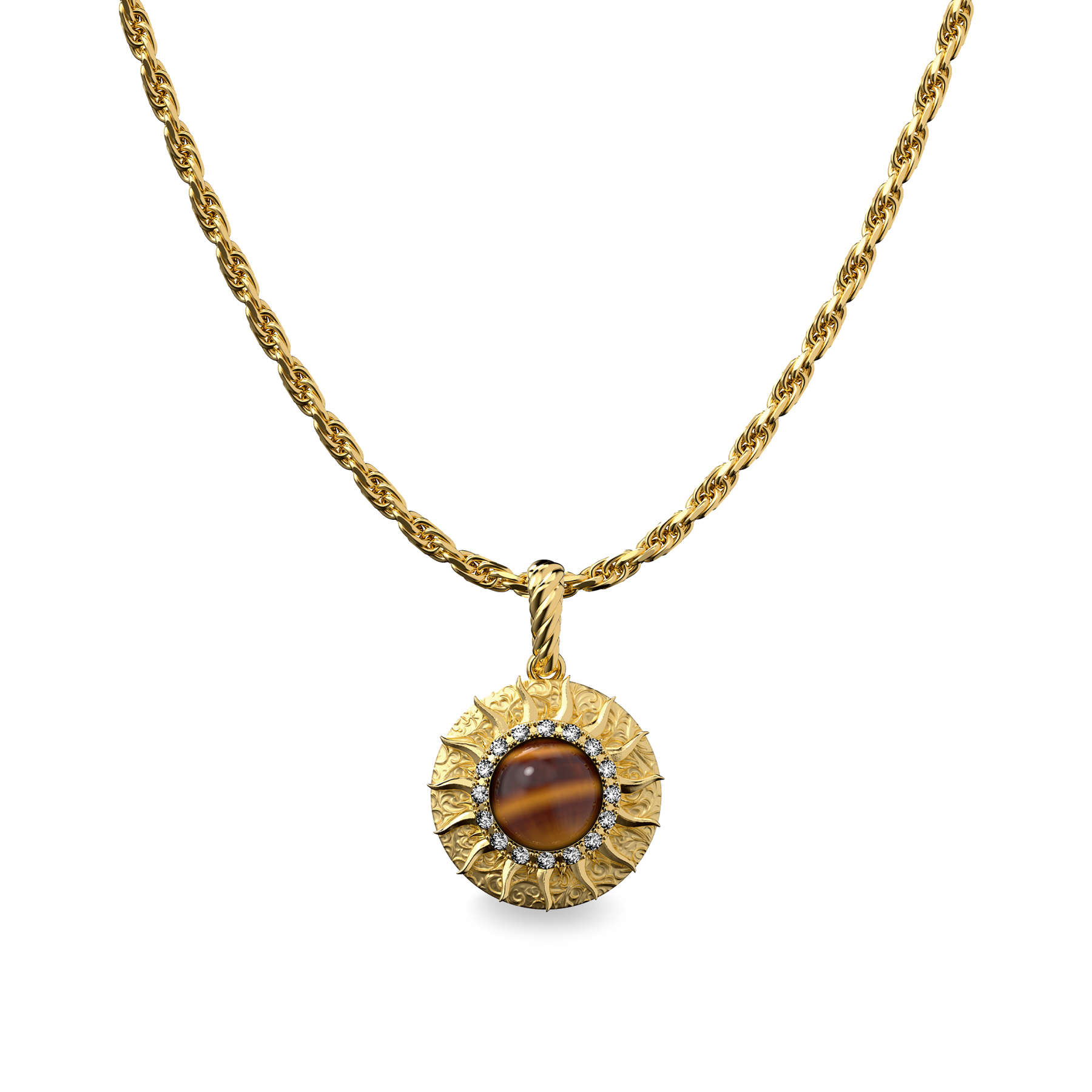 The Sun embodies vitality, joy, and the creative spark that renews the soul. It shines as a symbol of clarity and optimism, reminding you to move forward with radiant purpose. Offered in both bracelet and pendant designs, the piece can be attuned to your inner rhythm through gemstone choice: Malachite encourages transformation and emotional flow; Tiger’s Eye strengthens willpower and self-belief; Obsidian anchors your energy, restoring stability and calm. Surrounded by brilliant lab-grown diamonds, each domed stone glows like sunlight in motion—amplifying your life force with luminous grace.
