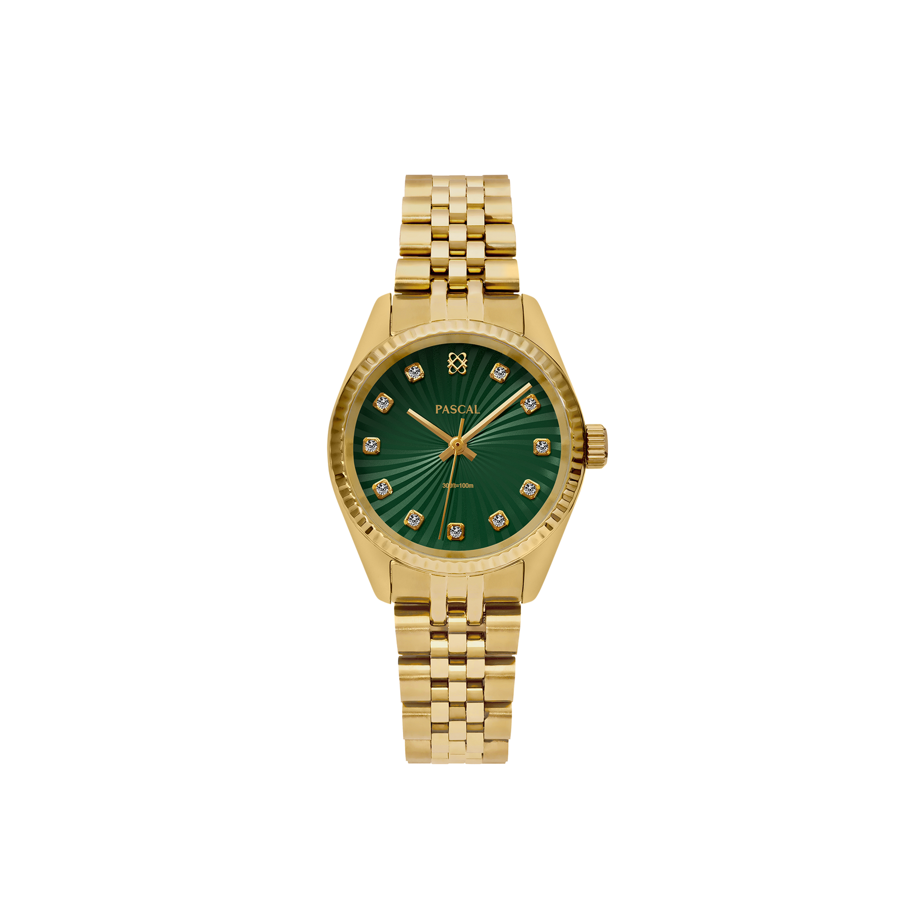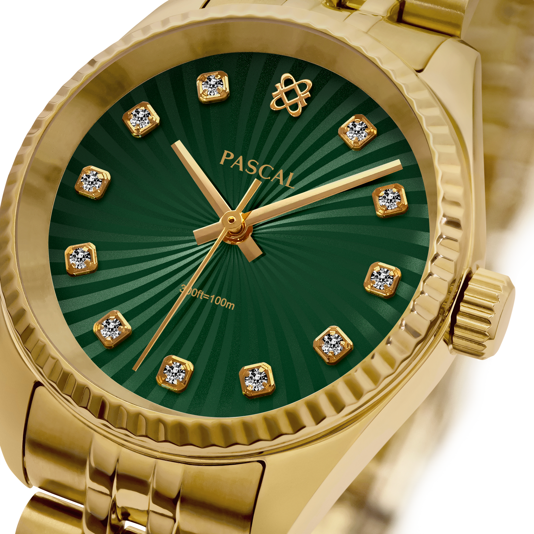 With its Green dial and gold case, this timepiece emanates a distinctive vintage allure. The dial displays a concave-convex radial texture, suitable for both casual wear and sophistication. Adorned with lab-grown diamonds, each hour marker sparkles with enchanting brilliance, enhancing the overall elegance of the design.