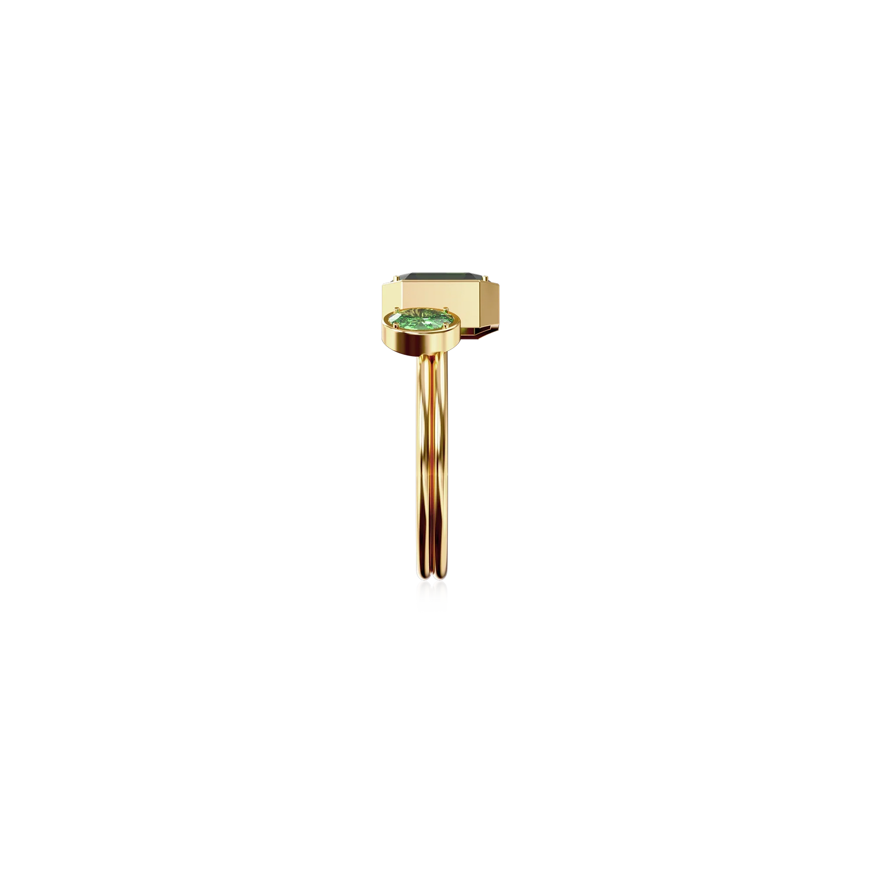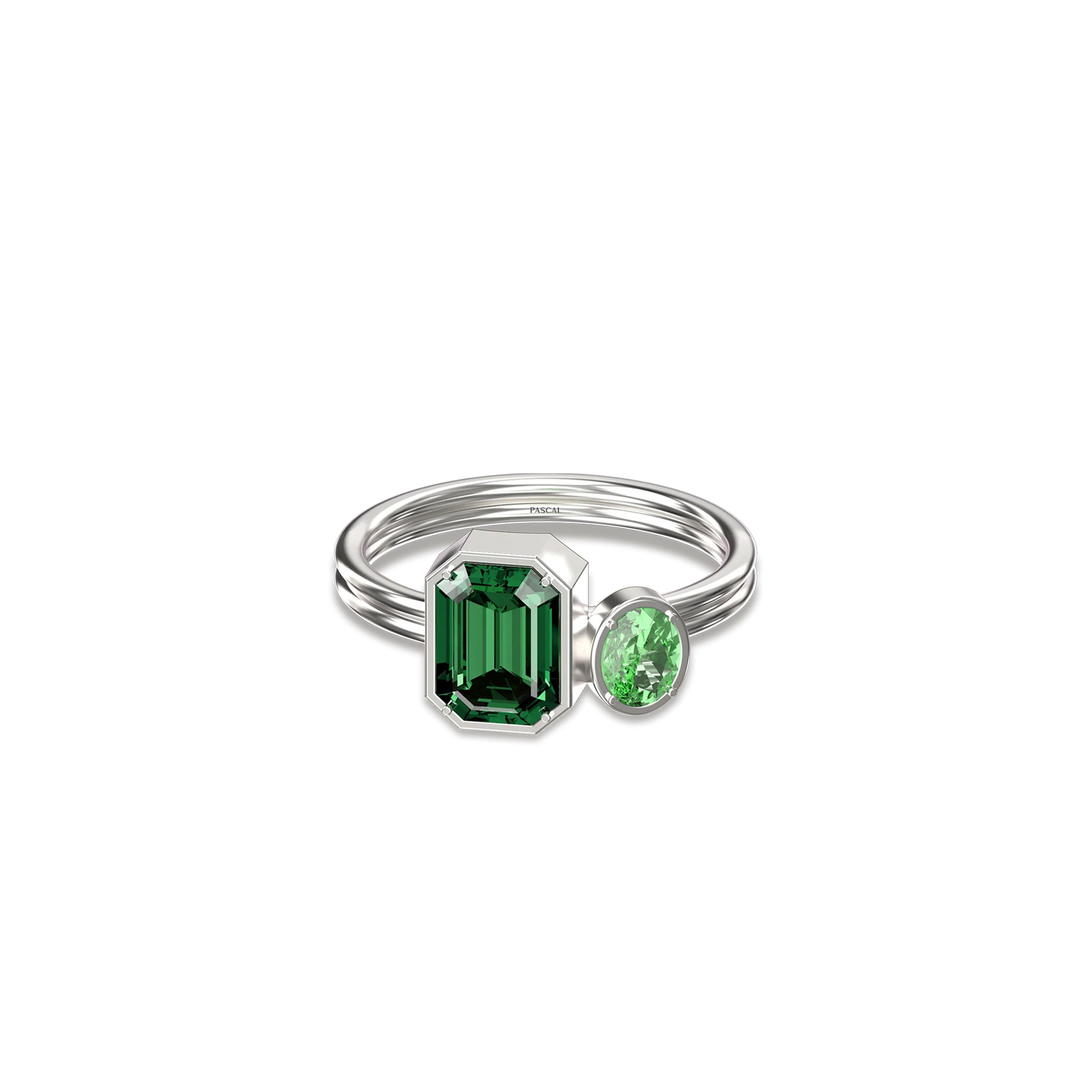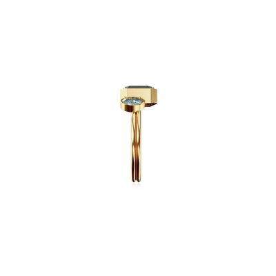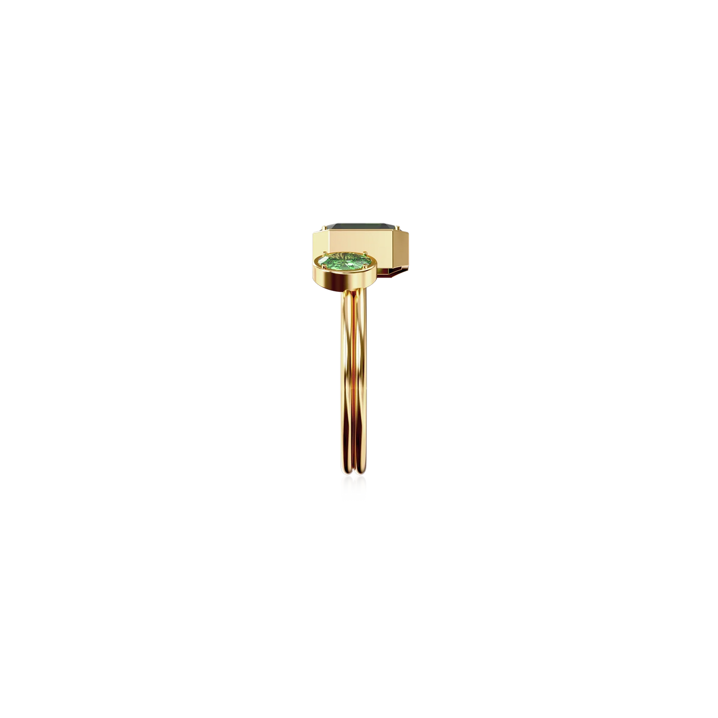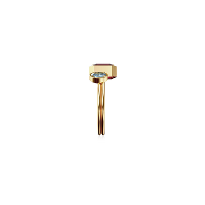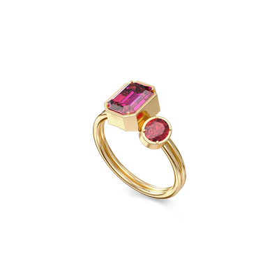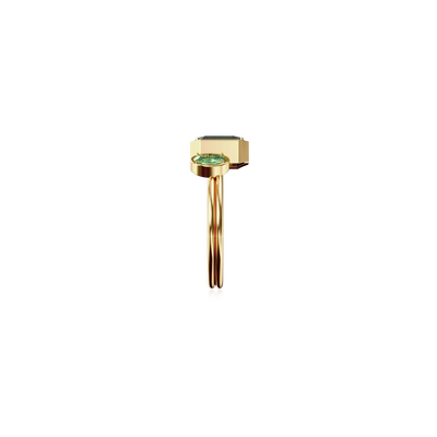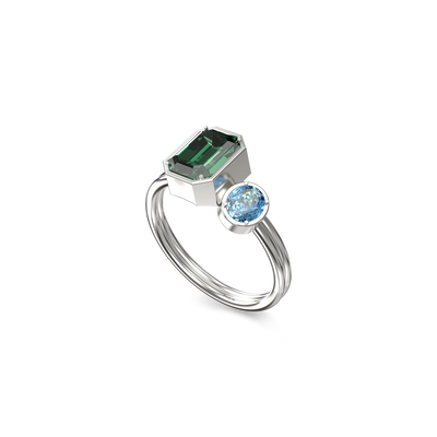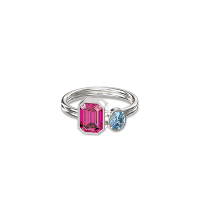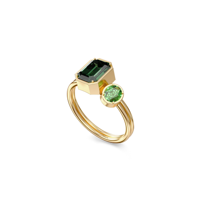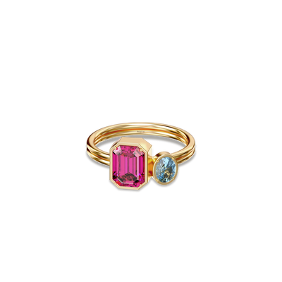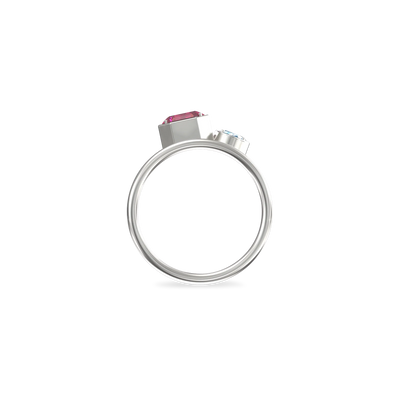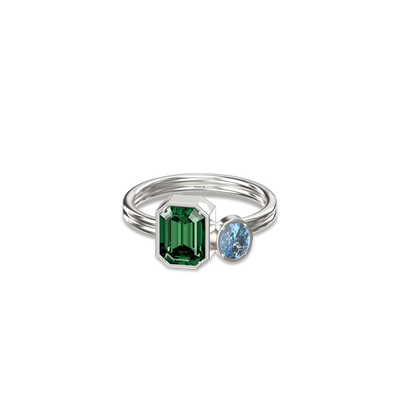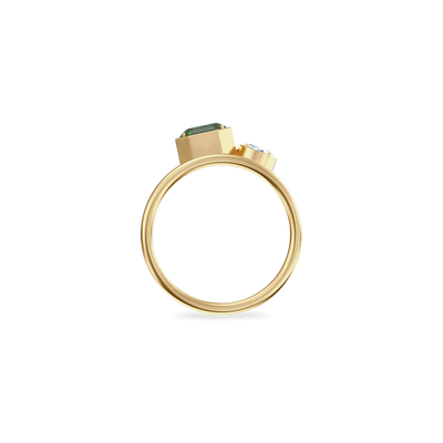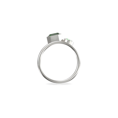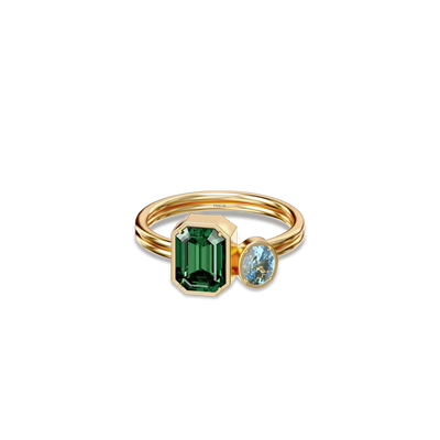 The Toi Et Moi Gemstone Ring features a unique stacked design concept, bringing together a larger emerald-cut lab- grown gemstone and a smaller oval-cut lab-grown gemstone in an intimate arrangement that symbolizes companionship and mutual support.