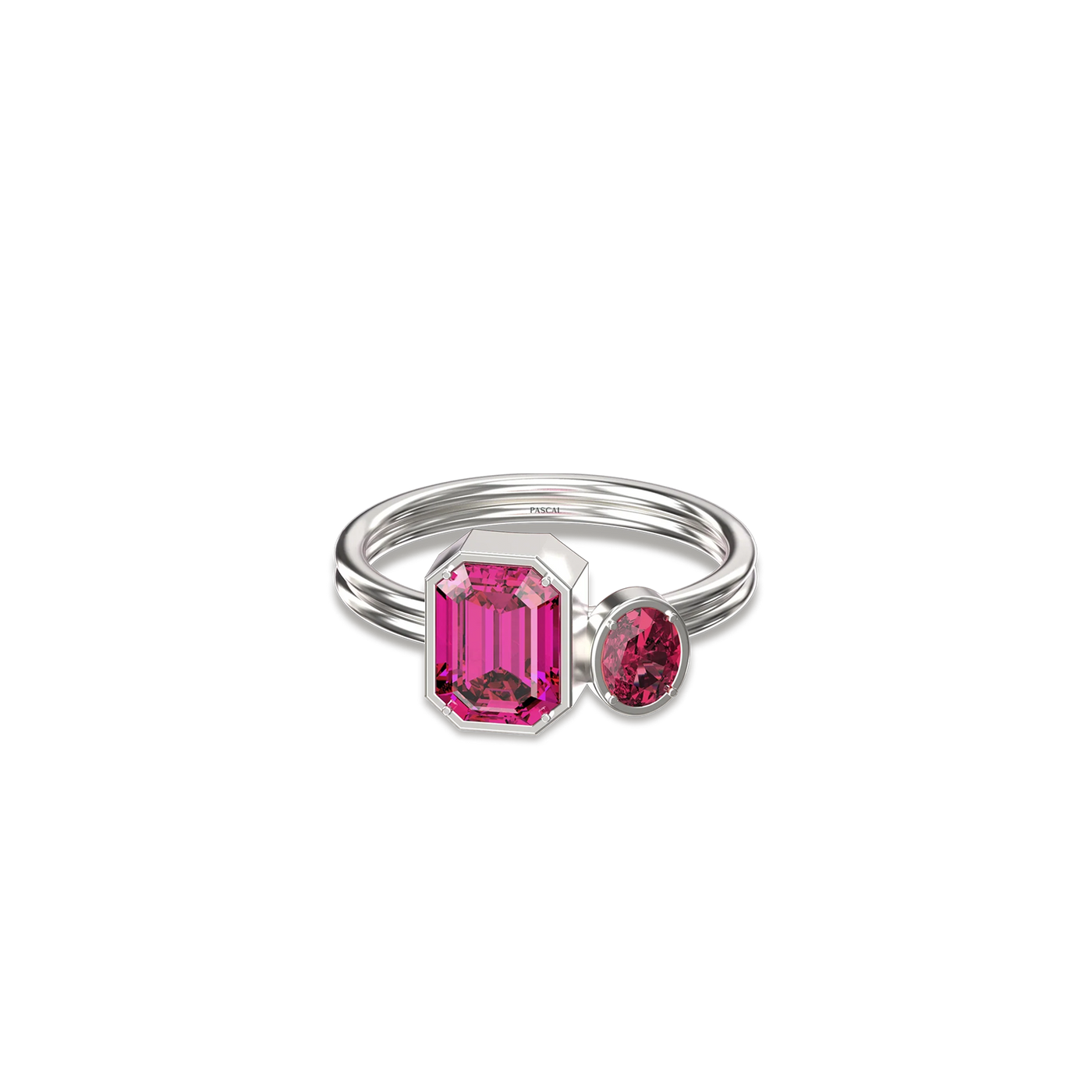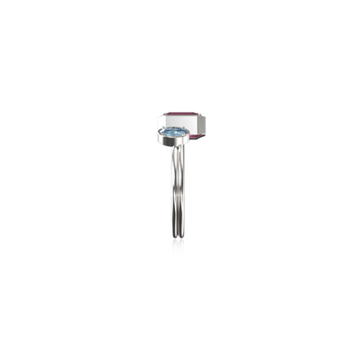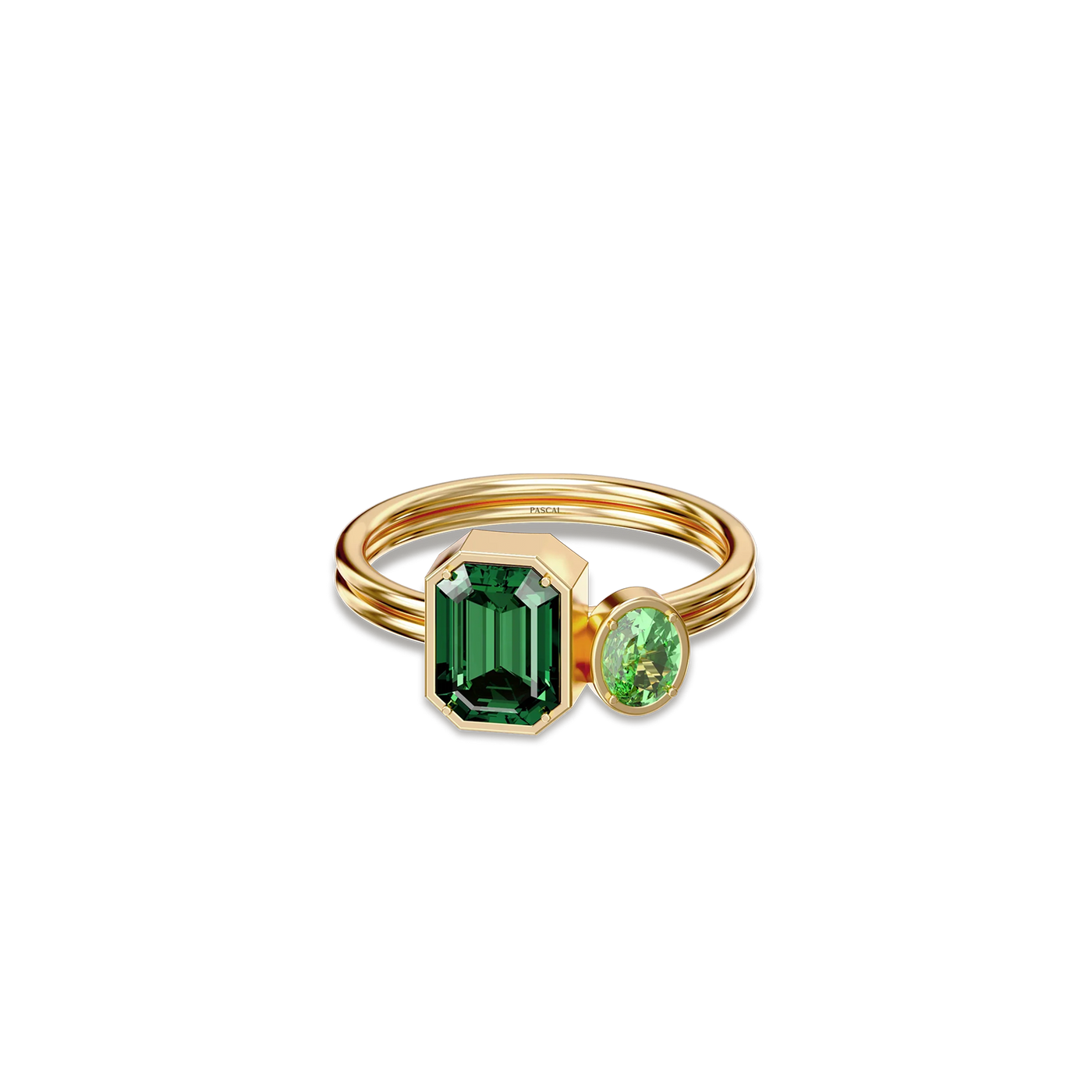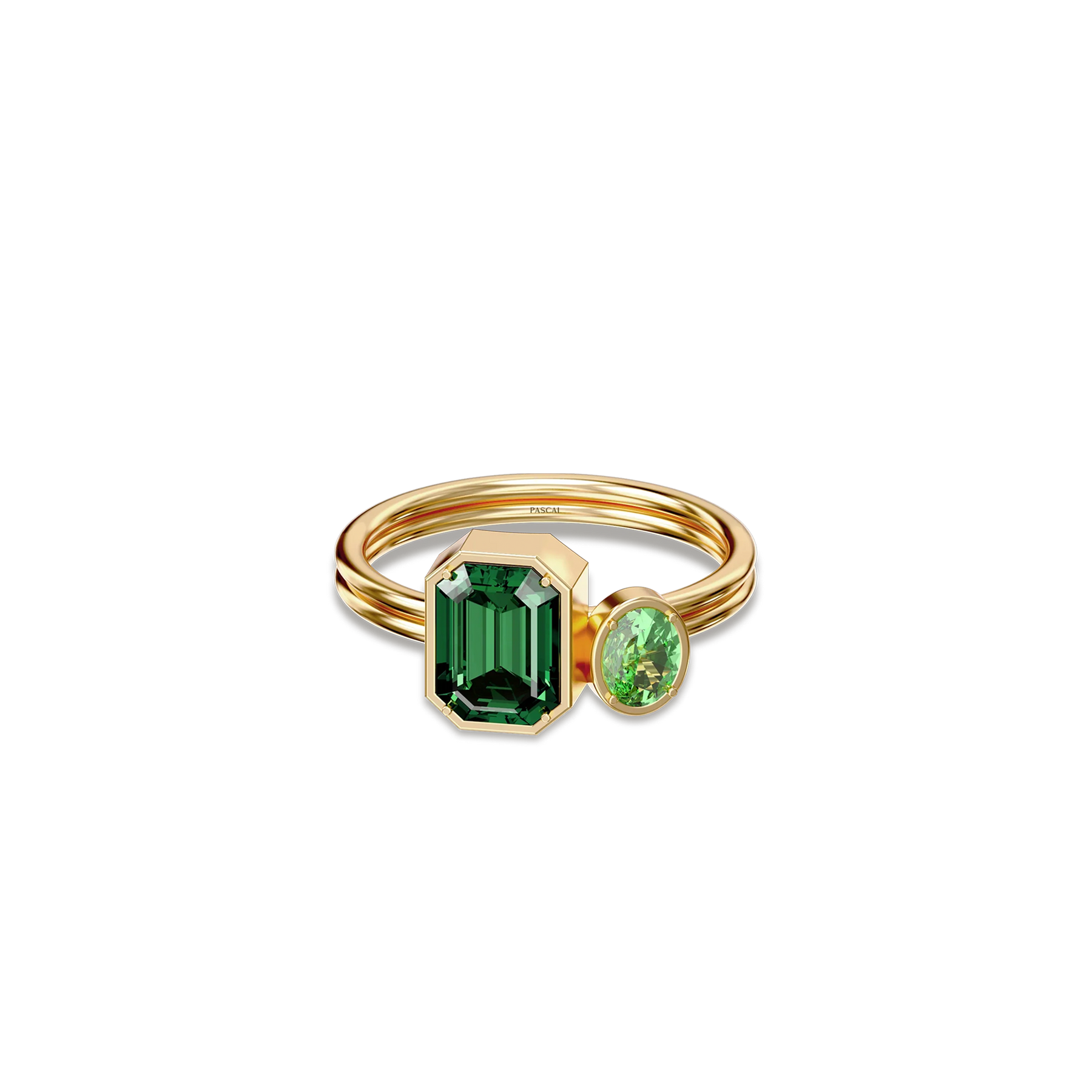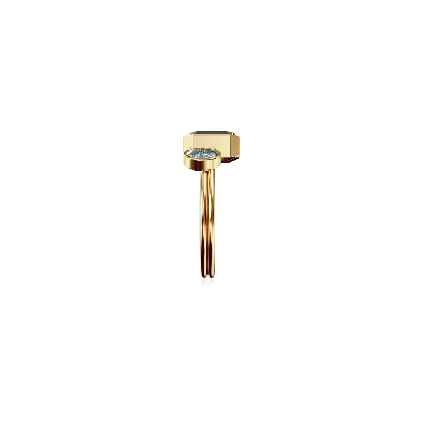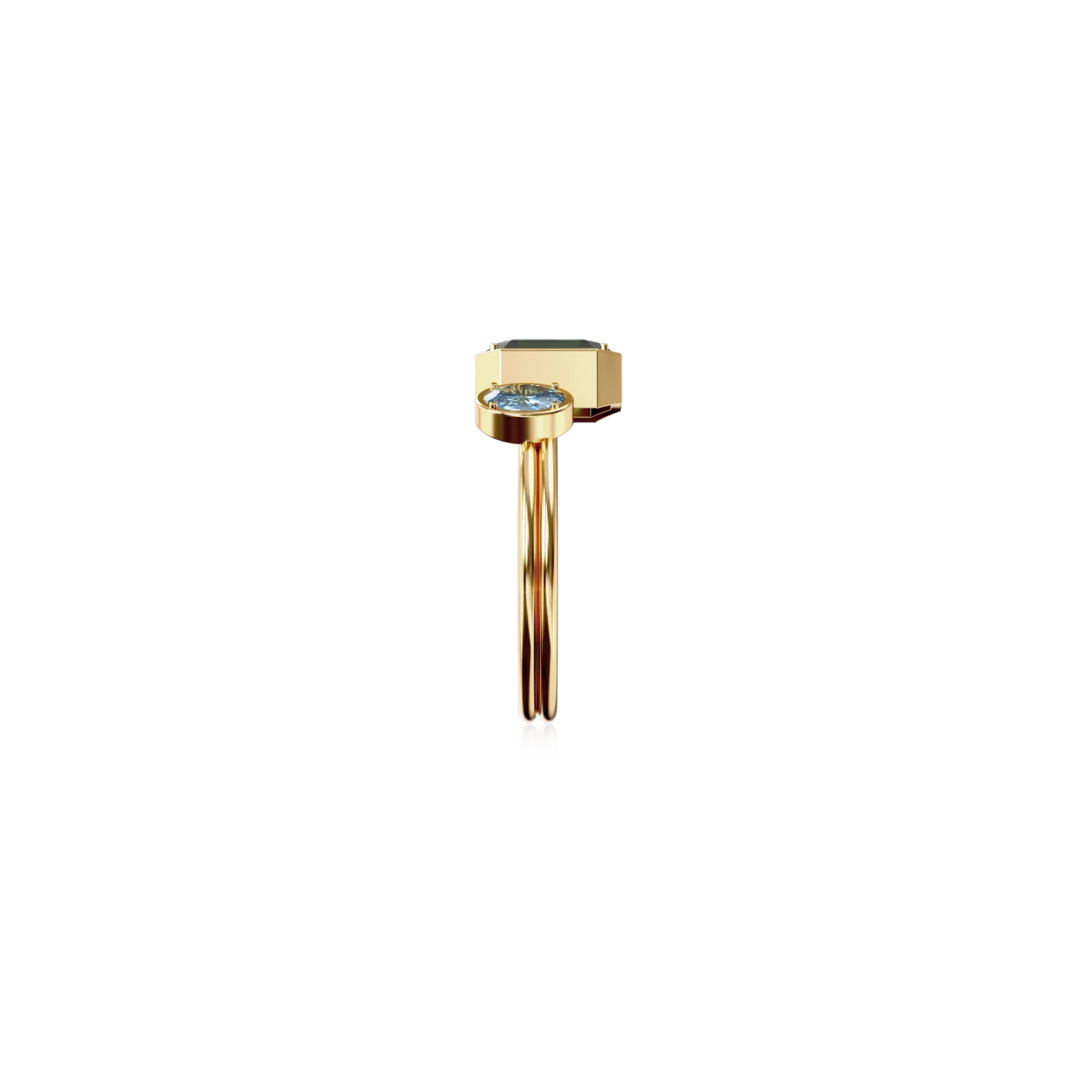 The Toi Et Moi Gemstone Ring features a unique stacked design concept, bringing together a larger emerald-cut lab- grown gemstone and a smaller oval-cut lab-grown gemstone in an intimate arrangement that symbolizes companionship and mutual support.