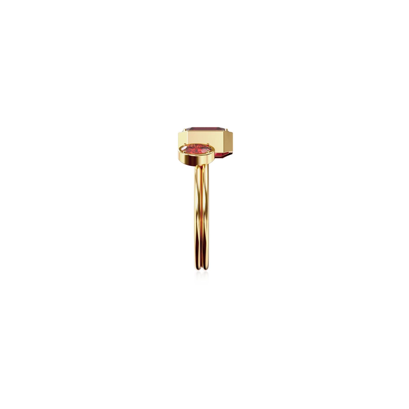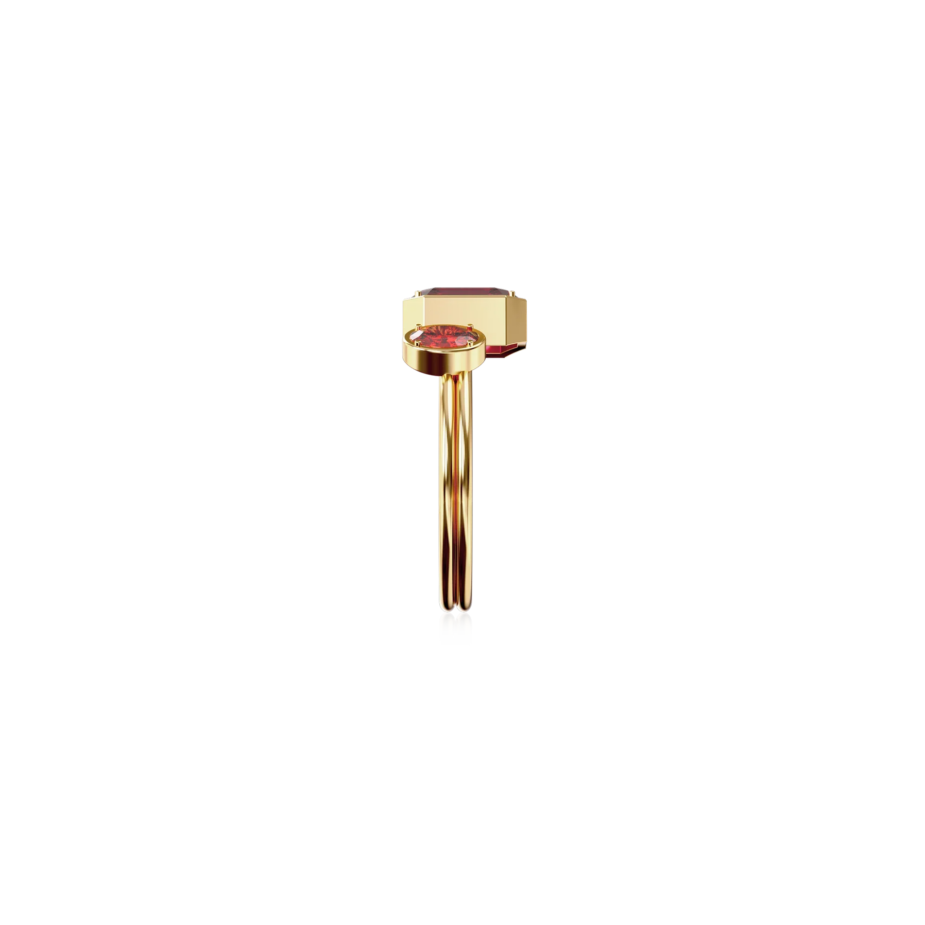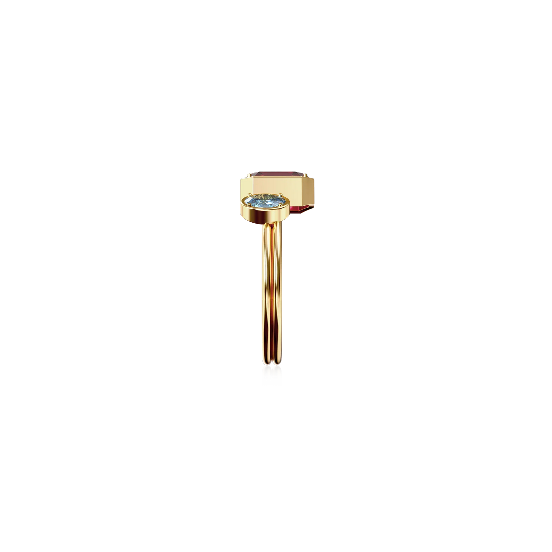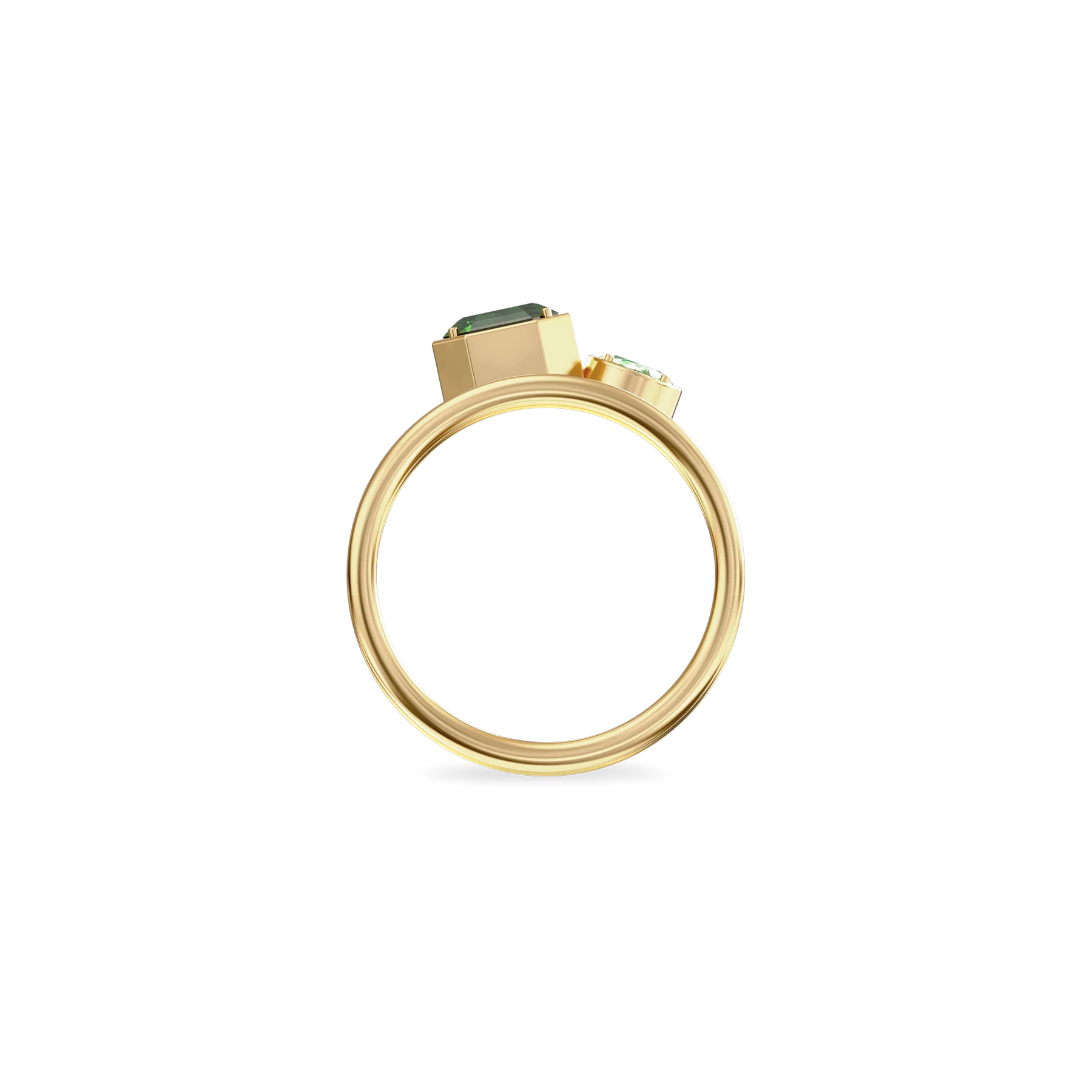 The Toi Et Moi Gemstone Ring features a unique stacked design concept, bringing together a larger emerald-cut lab- grown gemstone and a smaller oval-cut lab-grown gemstone in an intimate arrangement that symbolizes companionship and mutual support.