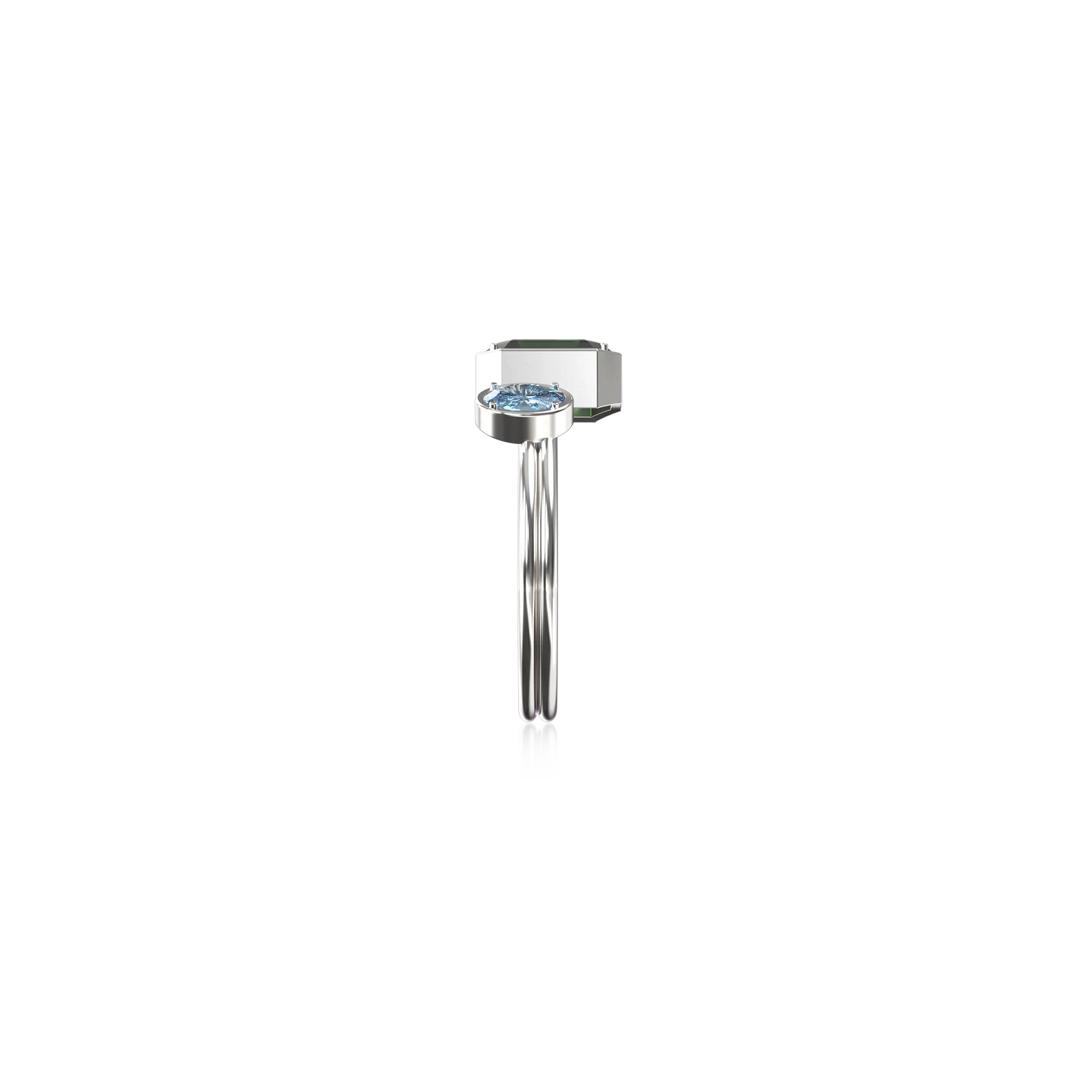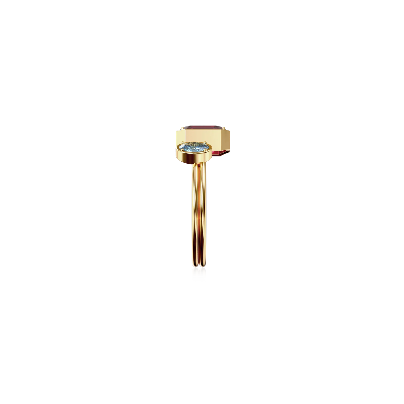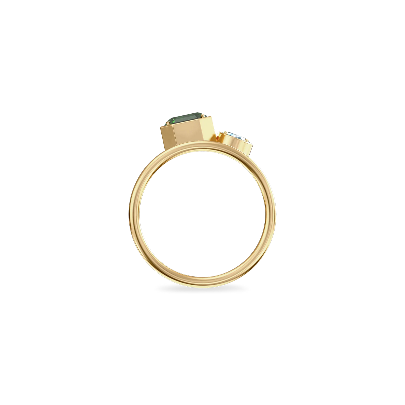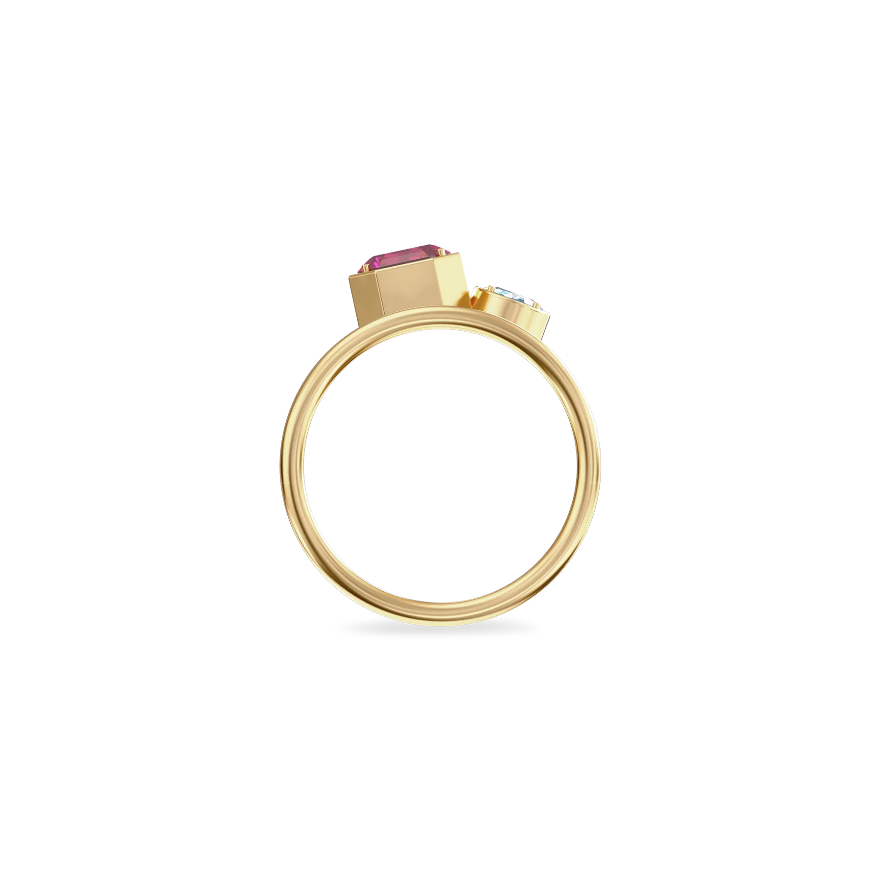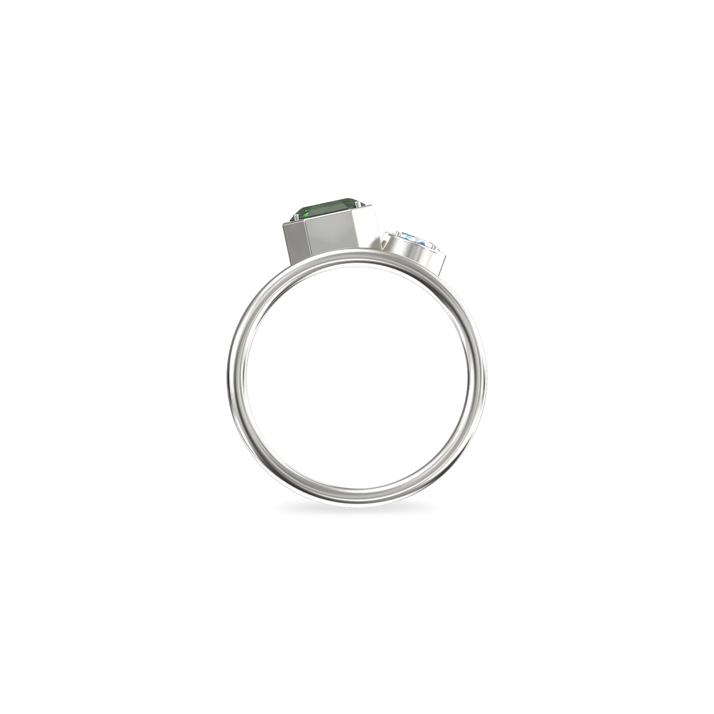 The Toi Et Moi Gemstone Ring features a unique stacked design concept, bringing together a larger emerald-cut lab- grown gemstone and a smaller oval-cut lab-grown gemstone in an intimate arrangement that symbolizes companionship and mutual support.