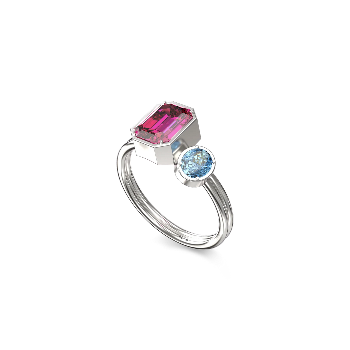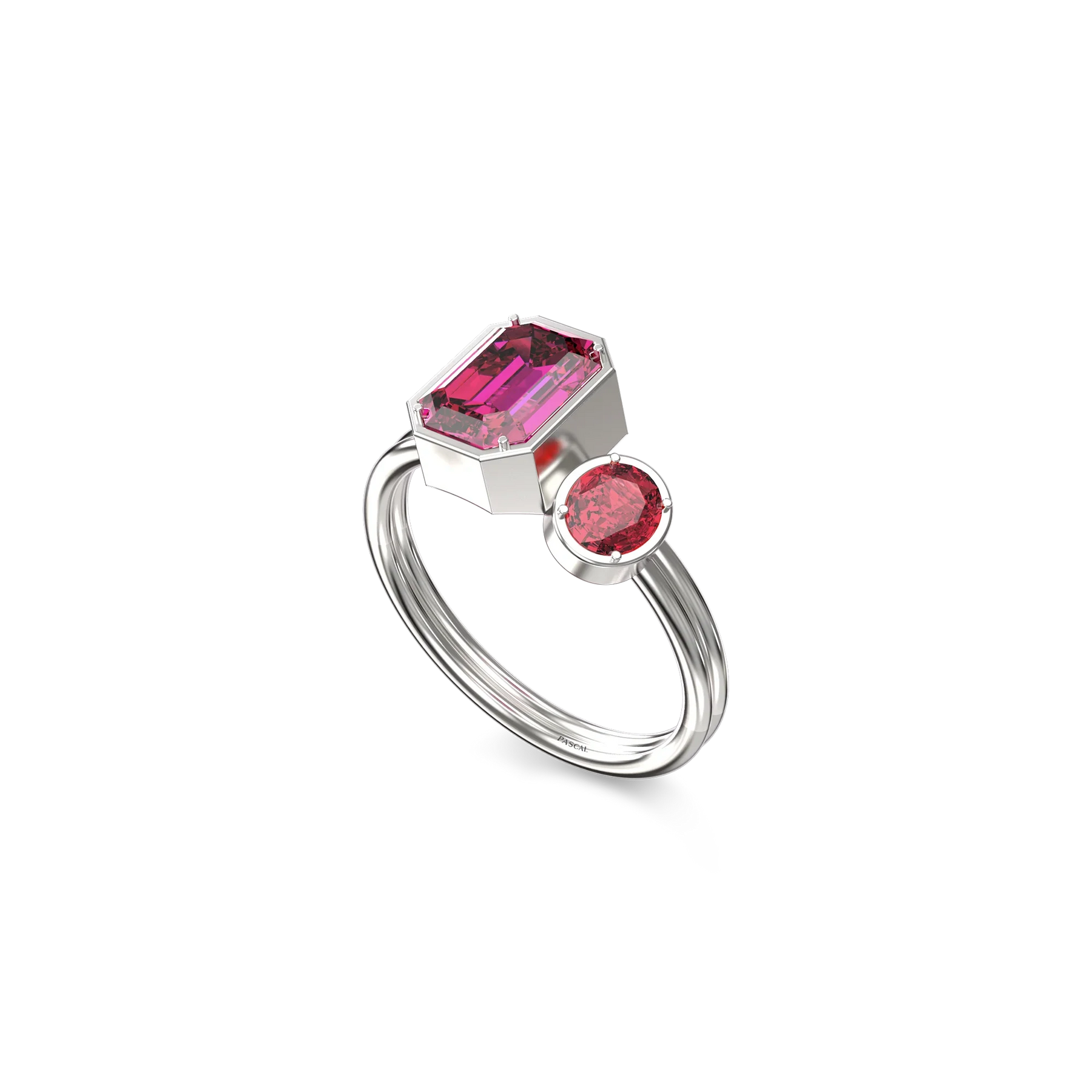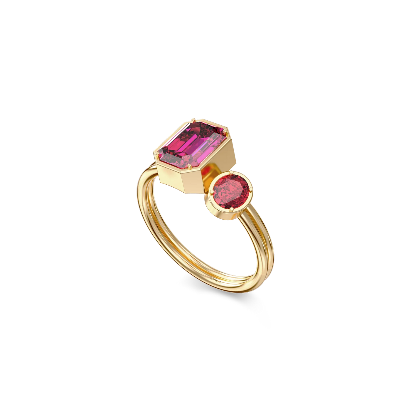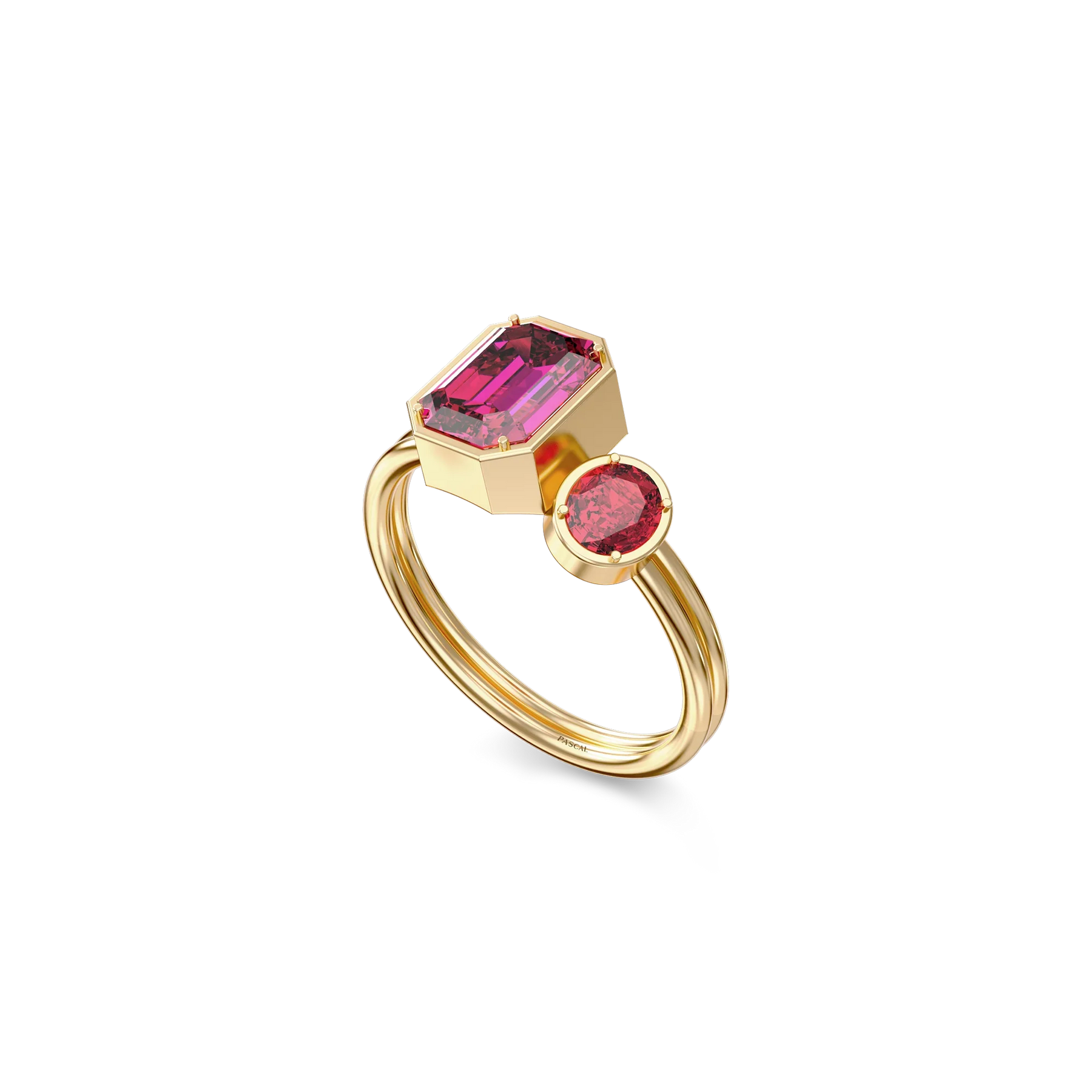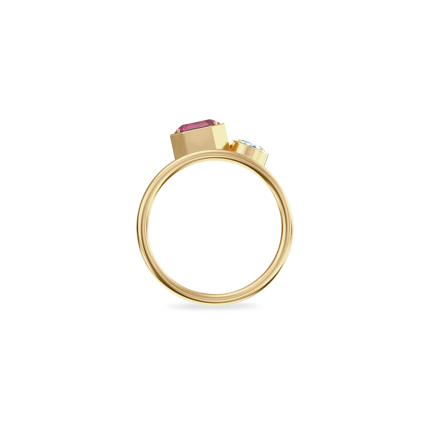 The Toi Et Moi Gemstone Ring features a unique stacked design concept, bringing together a larger emerald-cut lab- grown gemstone and a smaller oval-cut lab-grown gemstone in an intimate arrangement that symbolizes companionship and mutual support.