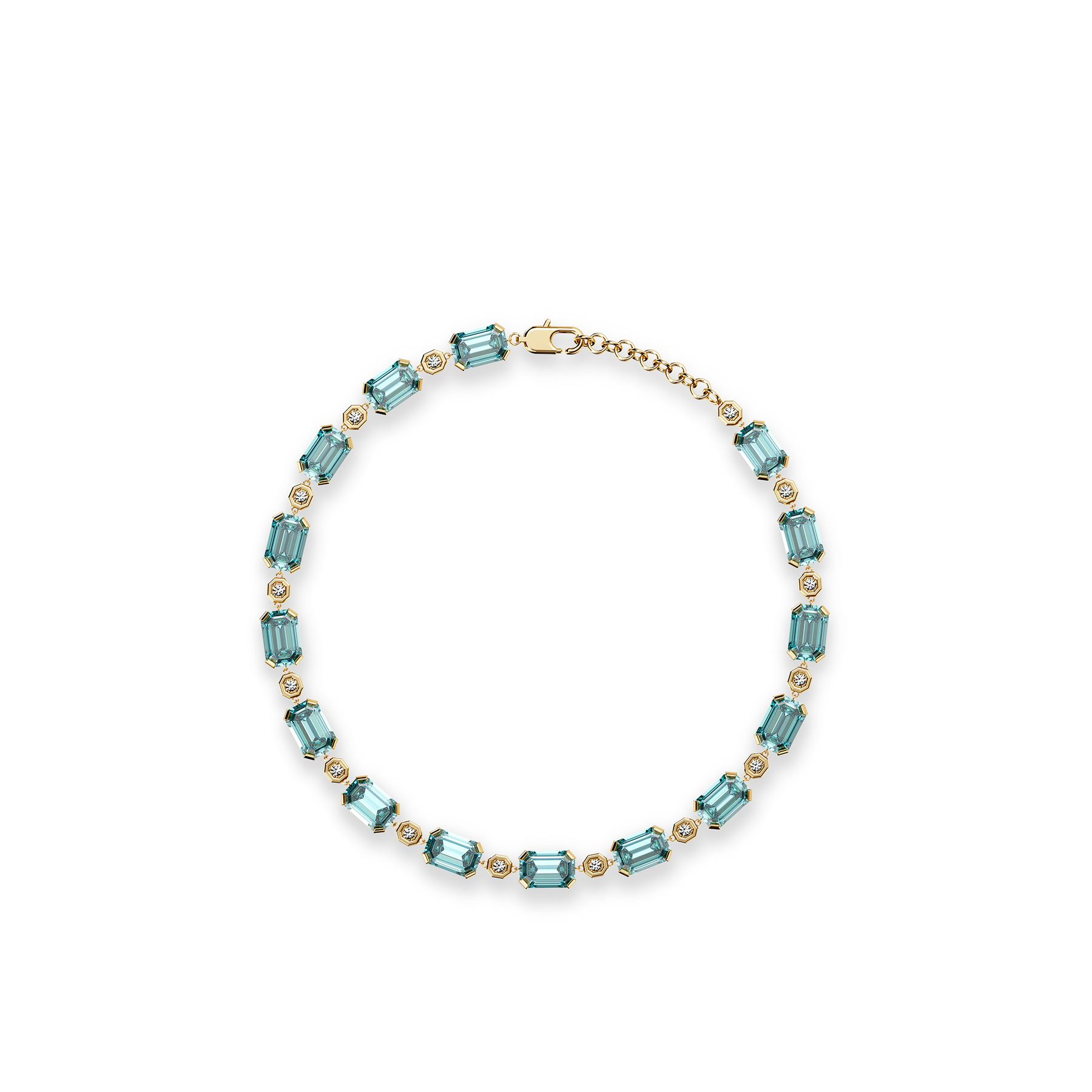 Uma pulseira multigem de diamantes composta por pedras preciosas e diamantes cultivados em laboratório. Disponível em opções azul-mar e verde, simboliza simplicidade e luxo. Evocando a vibração sofisticada de uma escapadela à beira-mar, brilha elegantemente contra a brisa tranquila do oceano.