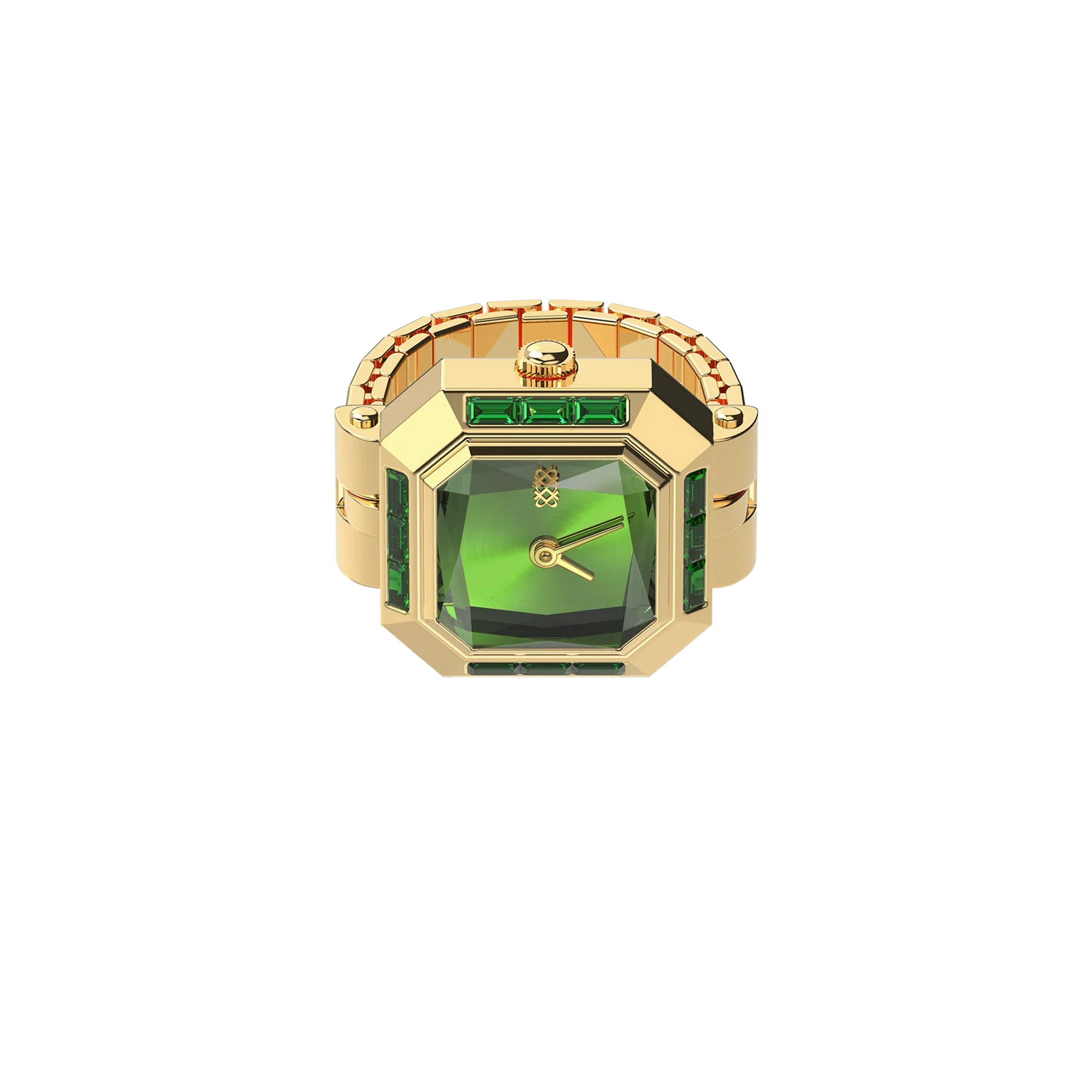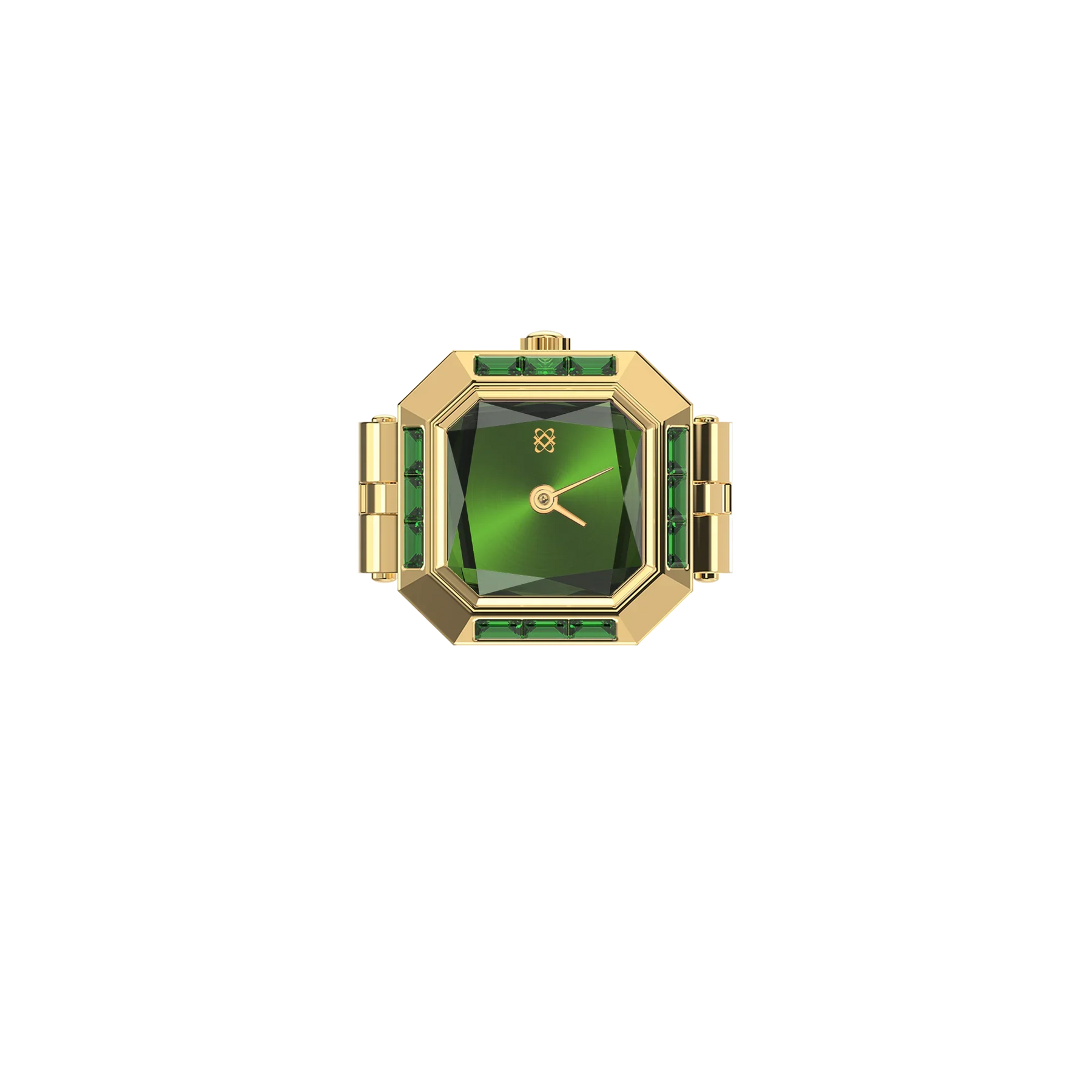 Este anel-relógio em forma de cubo de açúcar é invulgar porque o vidro luminoso do mostrador é cortado na forma de uma pedra preciosa tridimensional. Rodeado por pedras preciosas cultivadas em laboratório com corte baguete, assemelha-se a uma estrela cintilante. A caixa de cor dourada com mostrador em metal verde escuro escovado apresenta um aspeto único e elegante, adequado para todos os géneros e que pode ser usado com uma variedade de estilos e roupas.