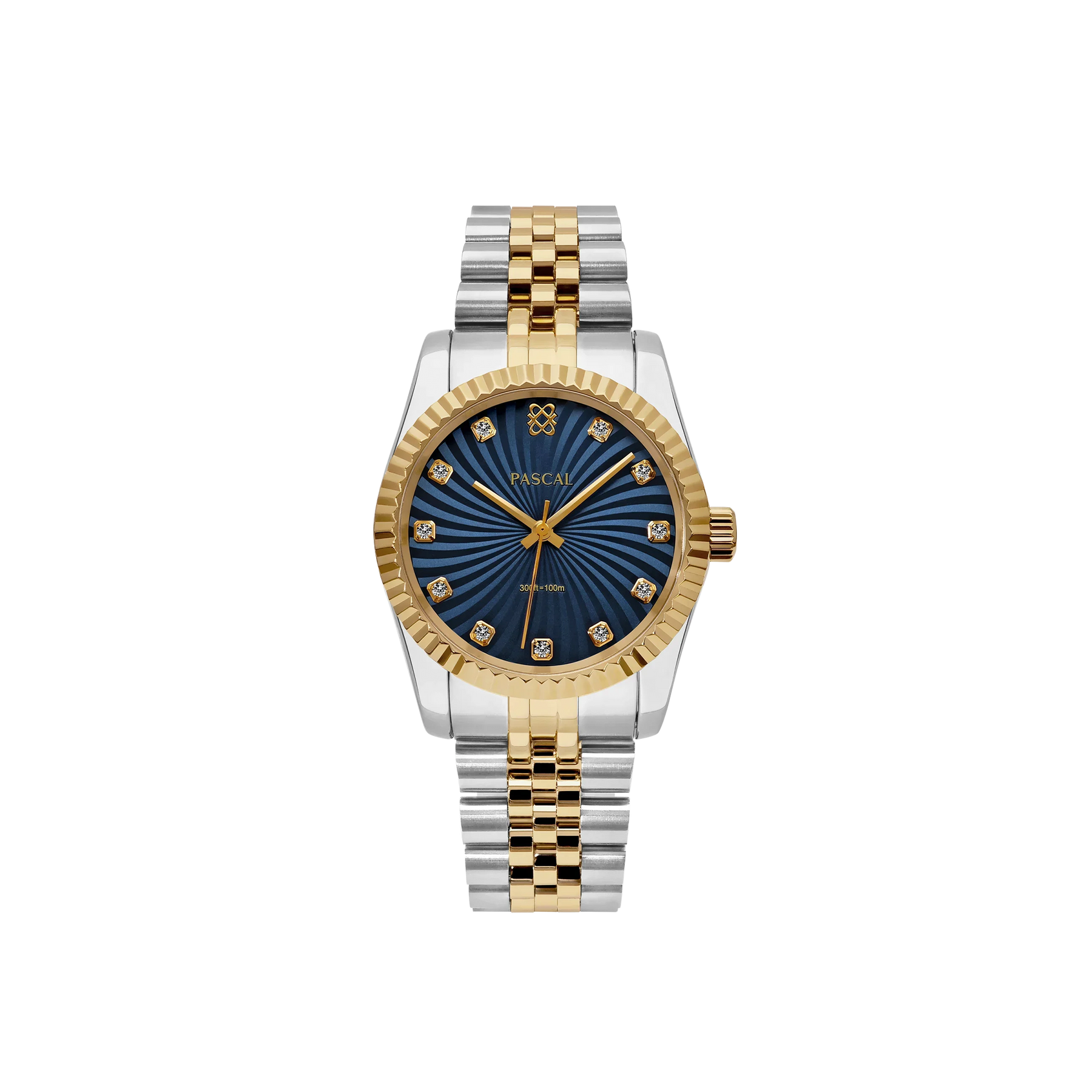 No relógio da série PASCAL Swirl, um mostrador azul profundo apresenta padrões texturizados e é adornado com 11 diamantes cultivados em laboratório, evocando o fascínio hipnotizante do céu cósmico. Com o seu apelo elegante, é uma escolha versátil adequada para todos.