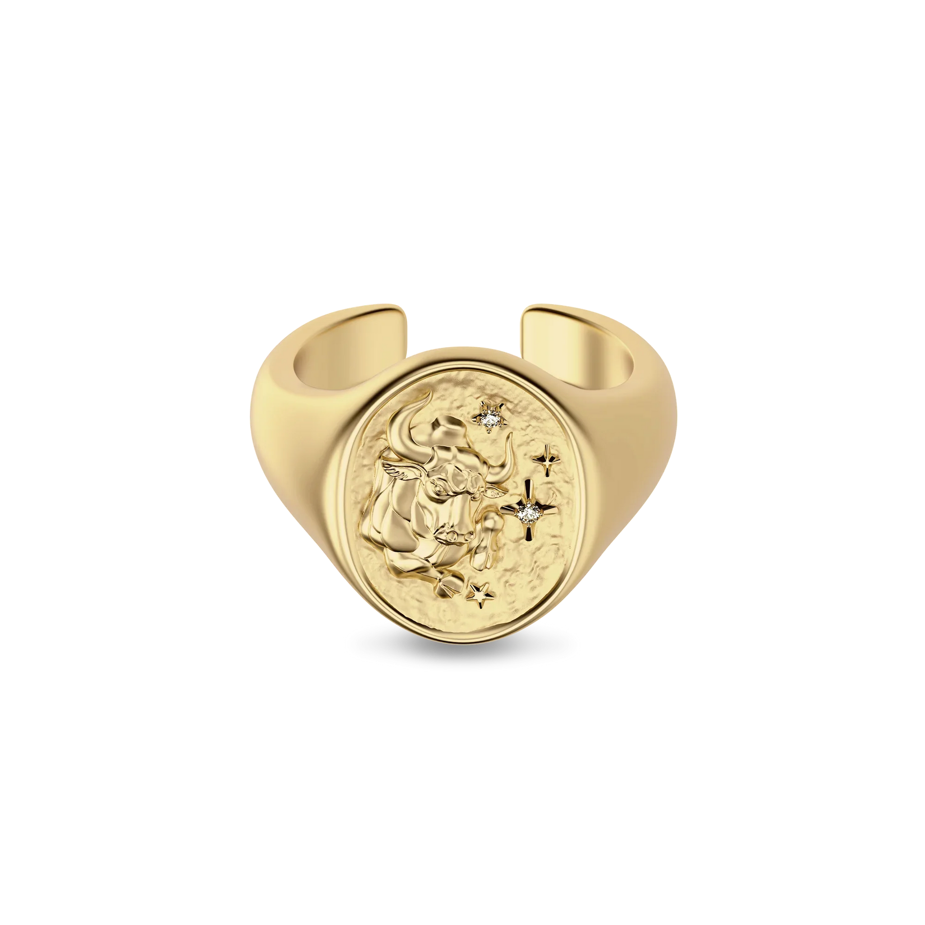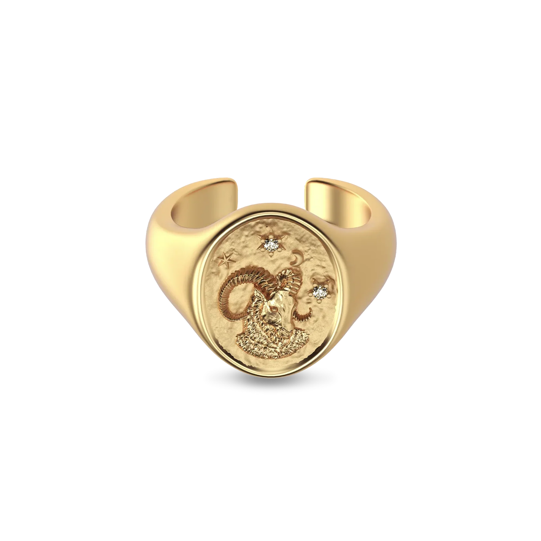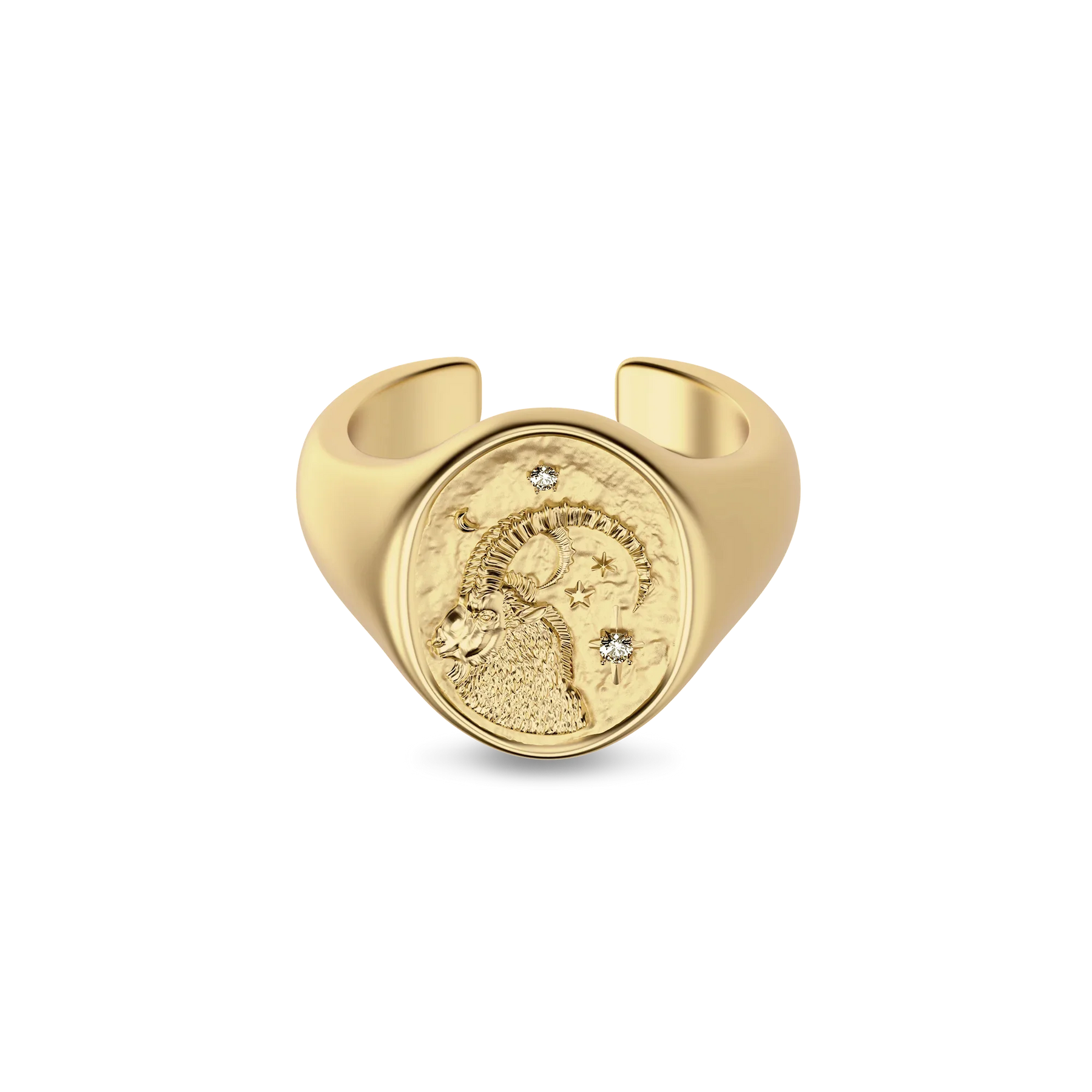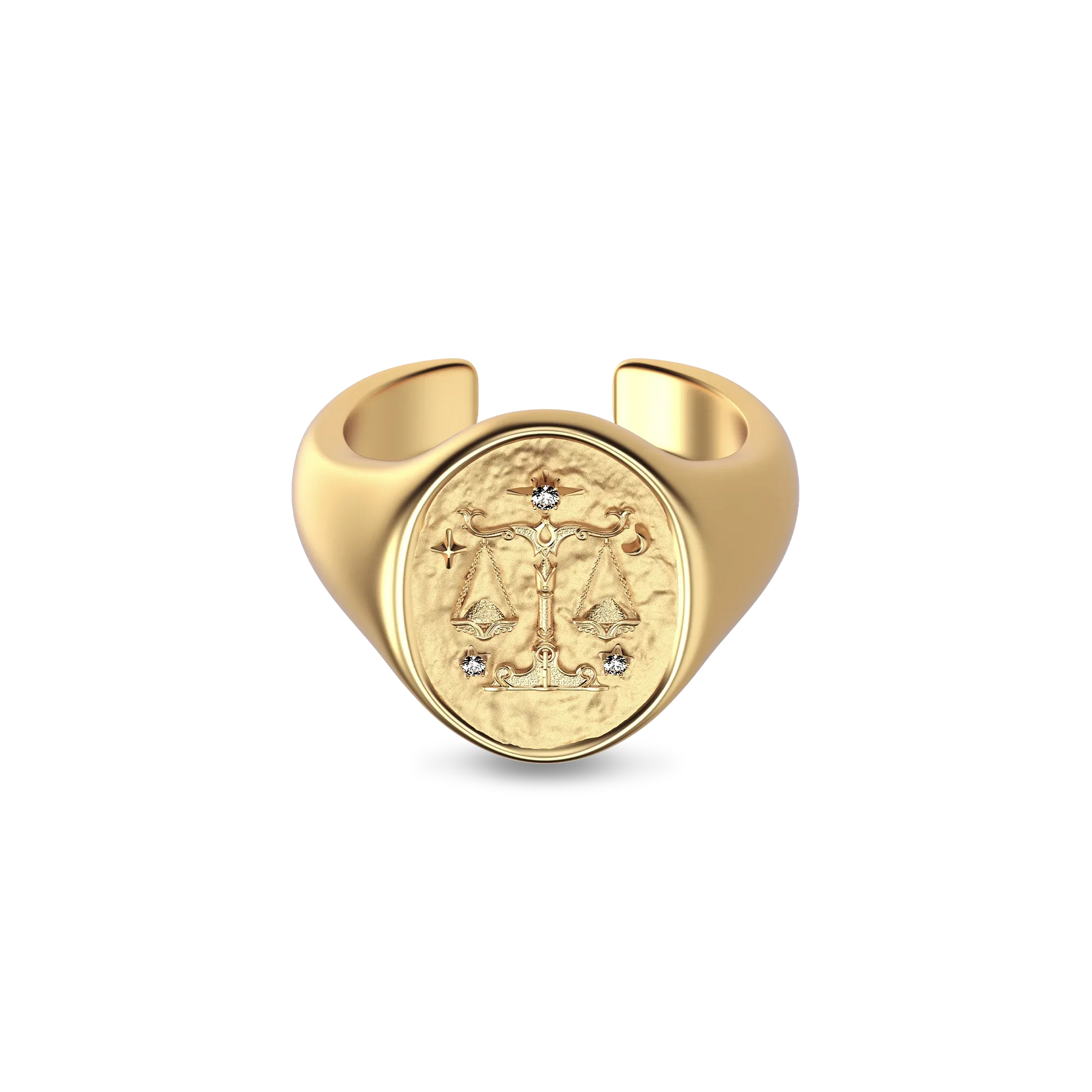 Os anéis são adornados com dois acentos de diamante, cada um definido em garras em forma de estrela, adicionando um toque celestial ao design. Os anéis são abertos nas extremidades, garantindo um ajuste versátil com quatro tamanhos diferentes disponíveis. Os símbolos do zodíaco são trabalhados em relevo, lembrando as gravações de moedas vintage, adicionando uma qualidade elegante e intemporal a cada peça. Perfeitos para expressar a sua individualidade e conexão com o cosmos, a nossa Coleção Zodíaco é indispensável para quem procura adicionar um toque de elegância celestial à sua coleção de joias.