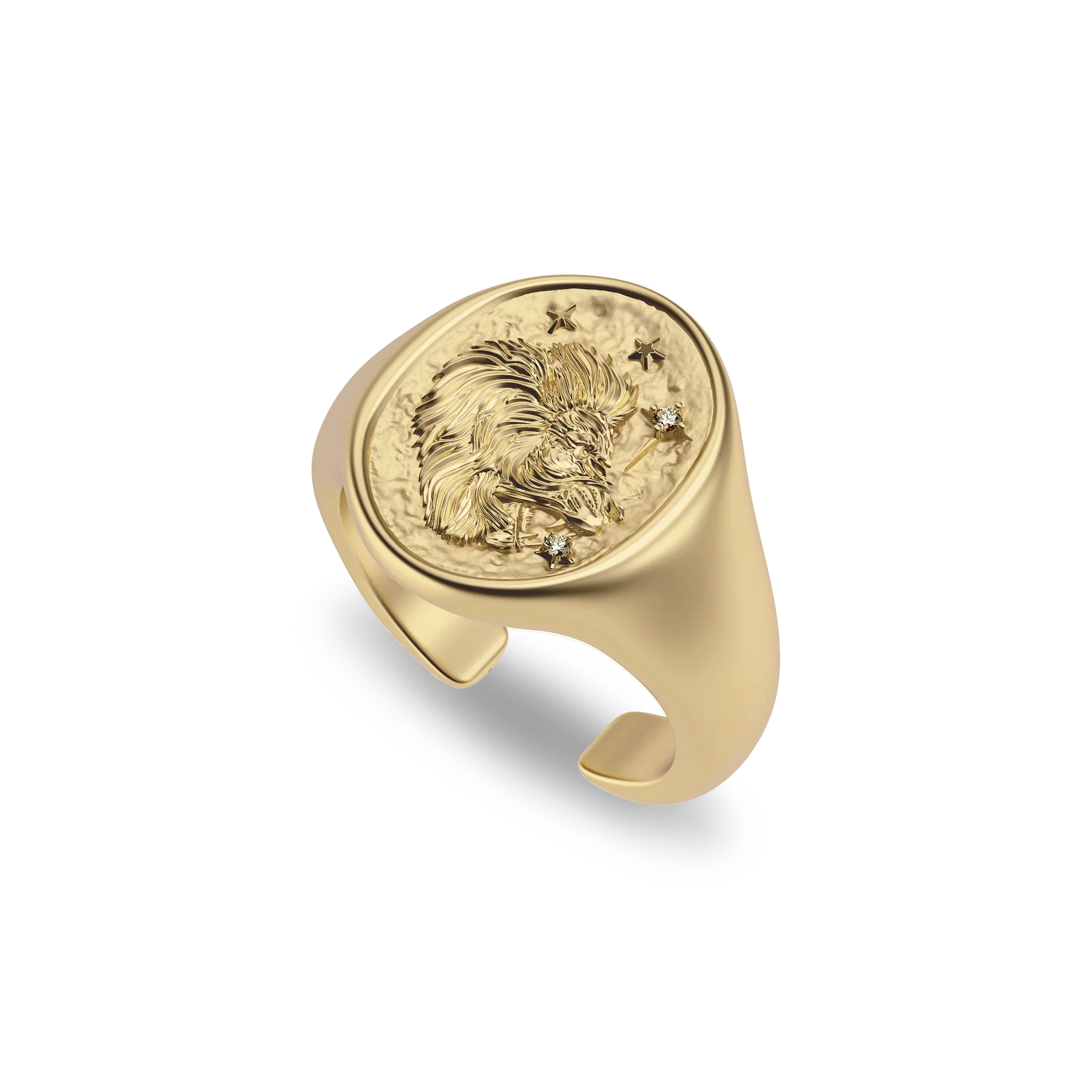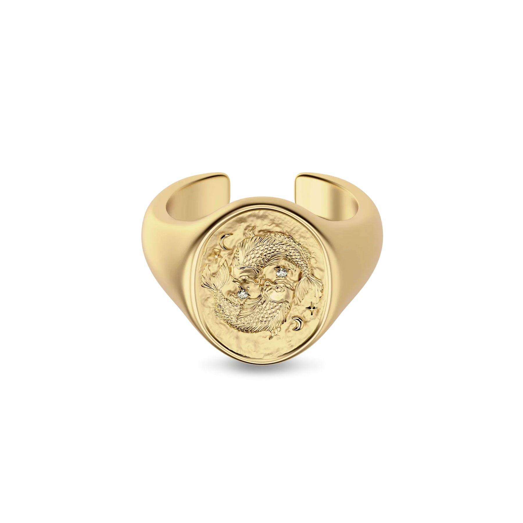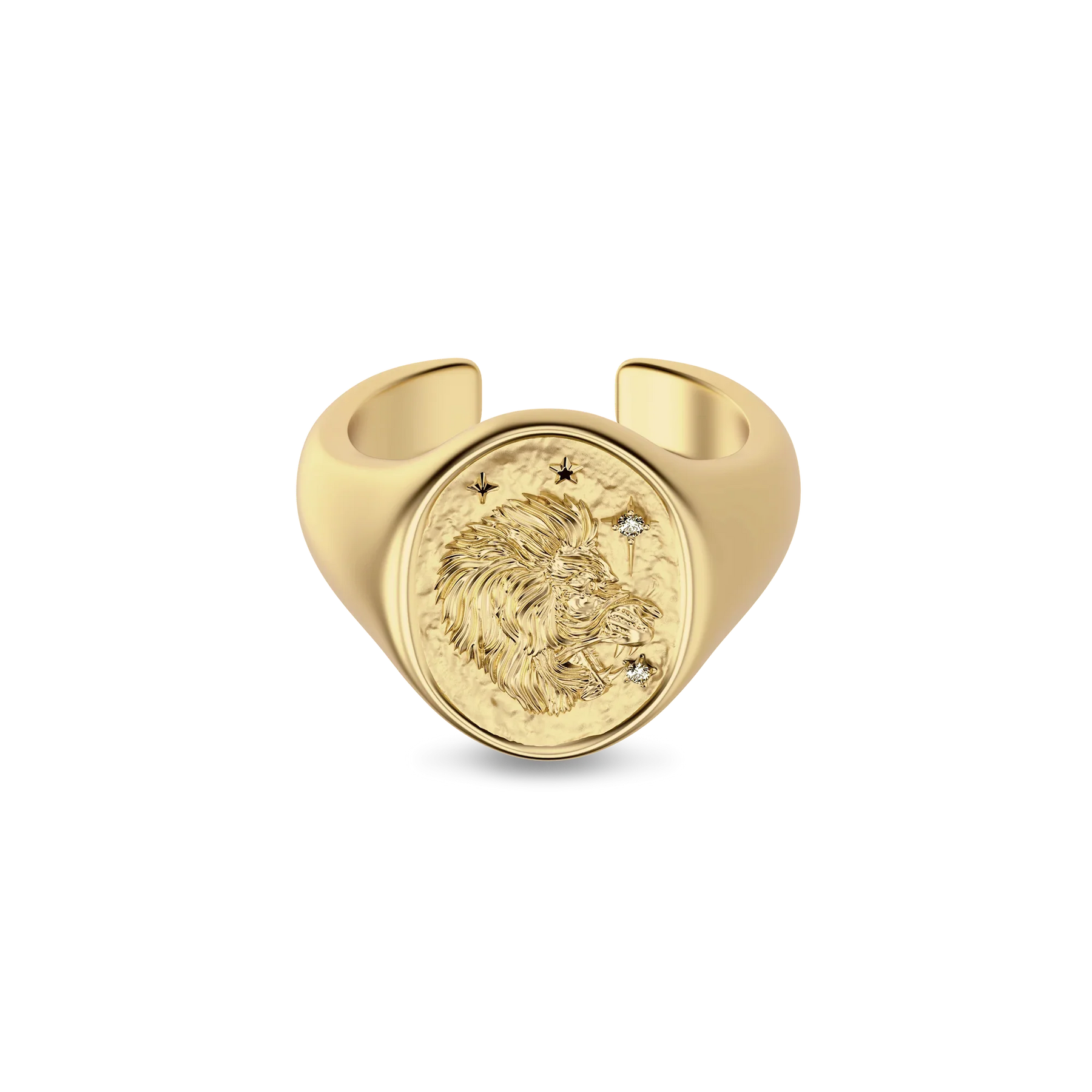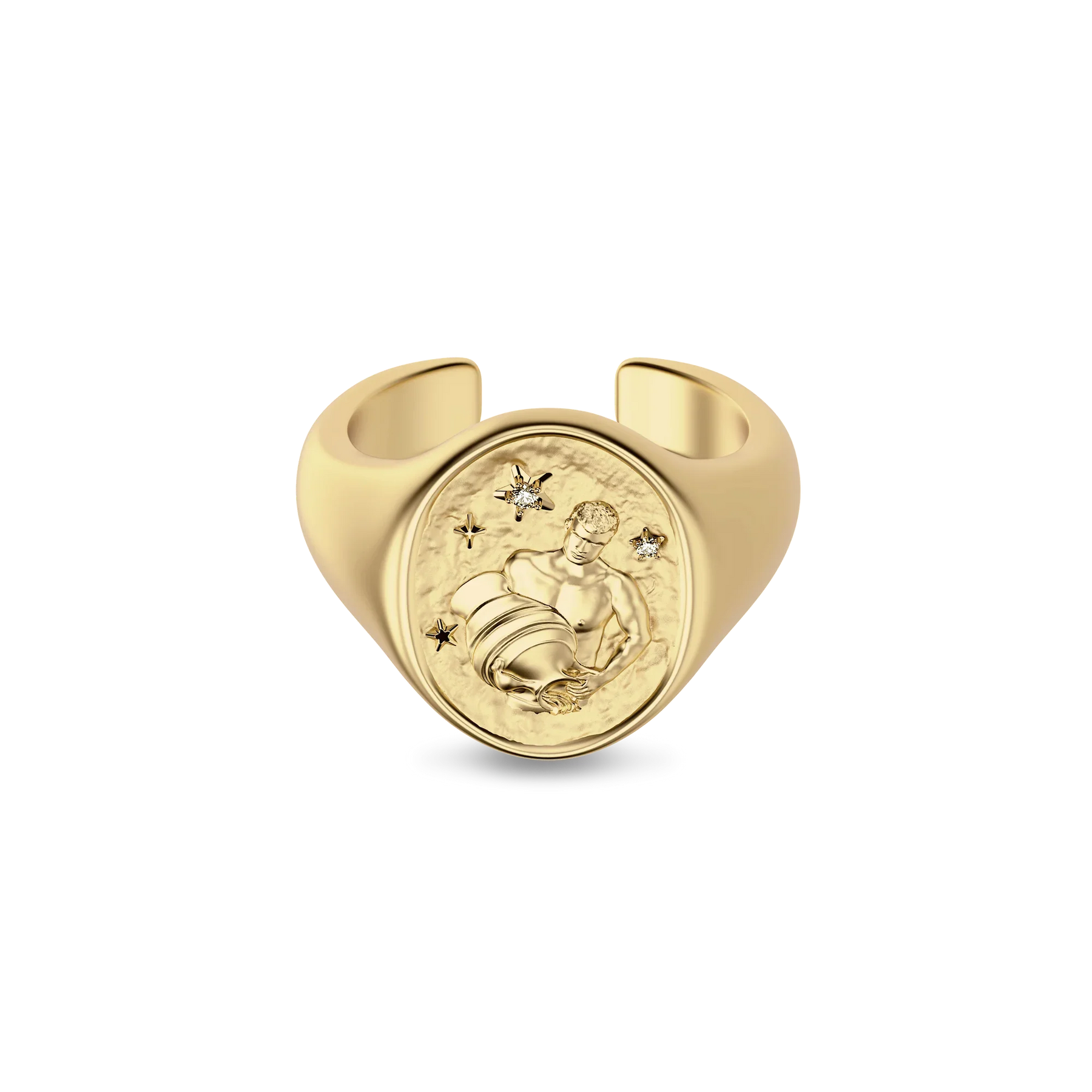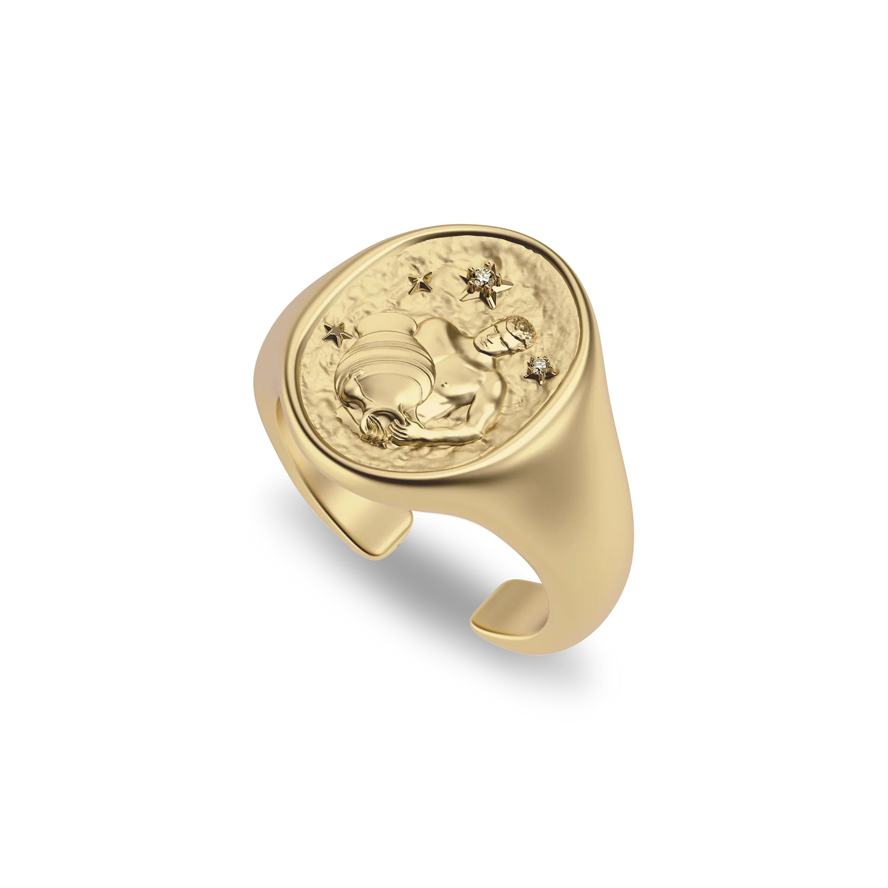 Os anéis são adornados com dois acentos de diamante, cada um definido em garras em forma de estrela, adicionando um toque celestial ao design. Os anéis são abertos nas extremidades, garantindo um ajuste versátil com quatro tamanhos diferentes disponíveis. Os símbolos do zodíaco são trabalhados em relevo, lembrando as gravações de moedas vintage, adicionando uma qualidade elegante e intemporal a cada peça. Perfeitos para expressar a sua individualidade e conexão com o cosmos, a nossa Coleção Zodíaco é indispensável para quem procura adicionar um toque de elegância celestial à sua coleção de joias.