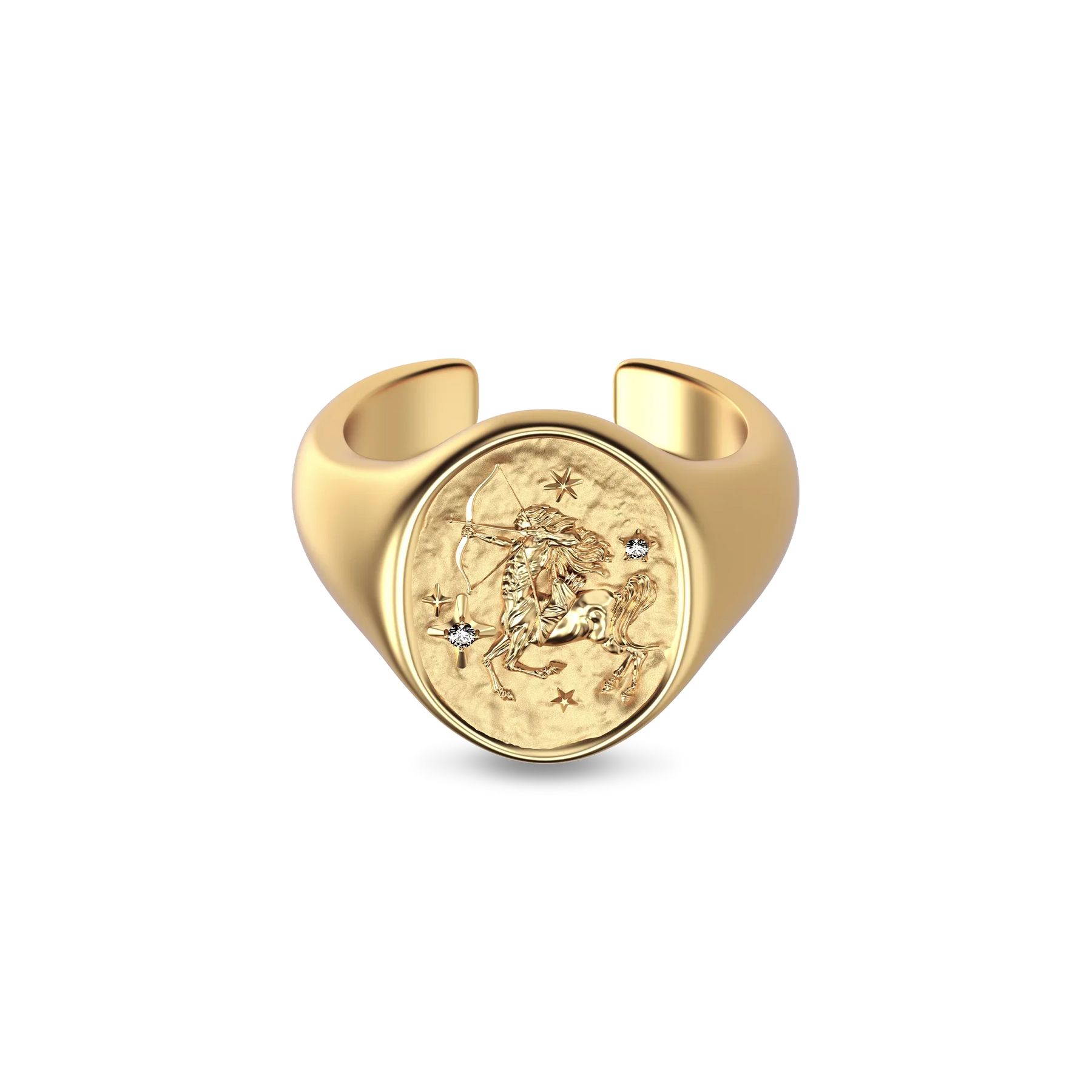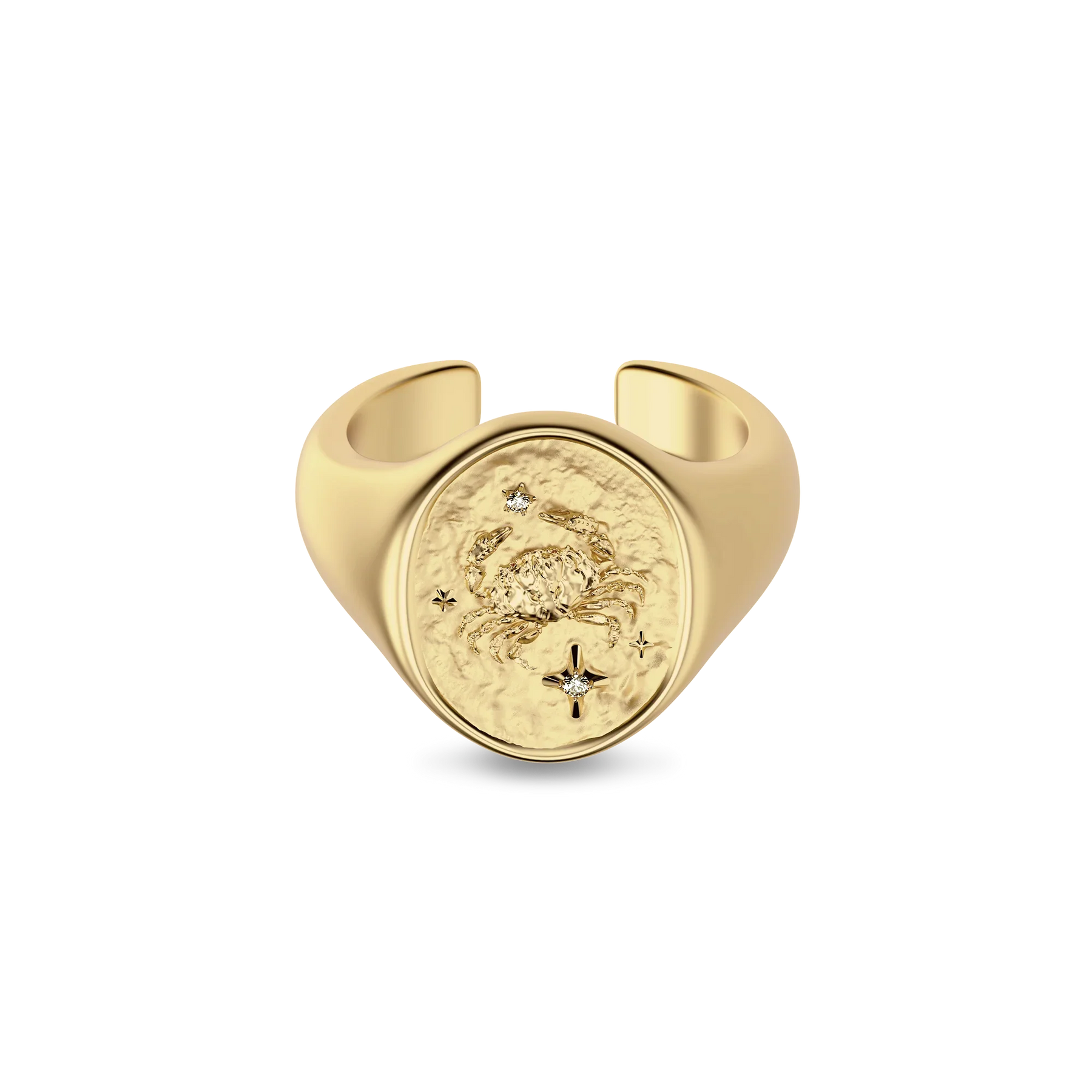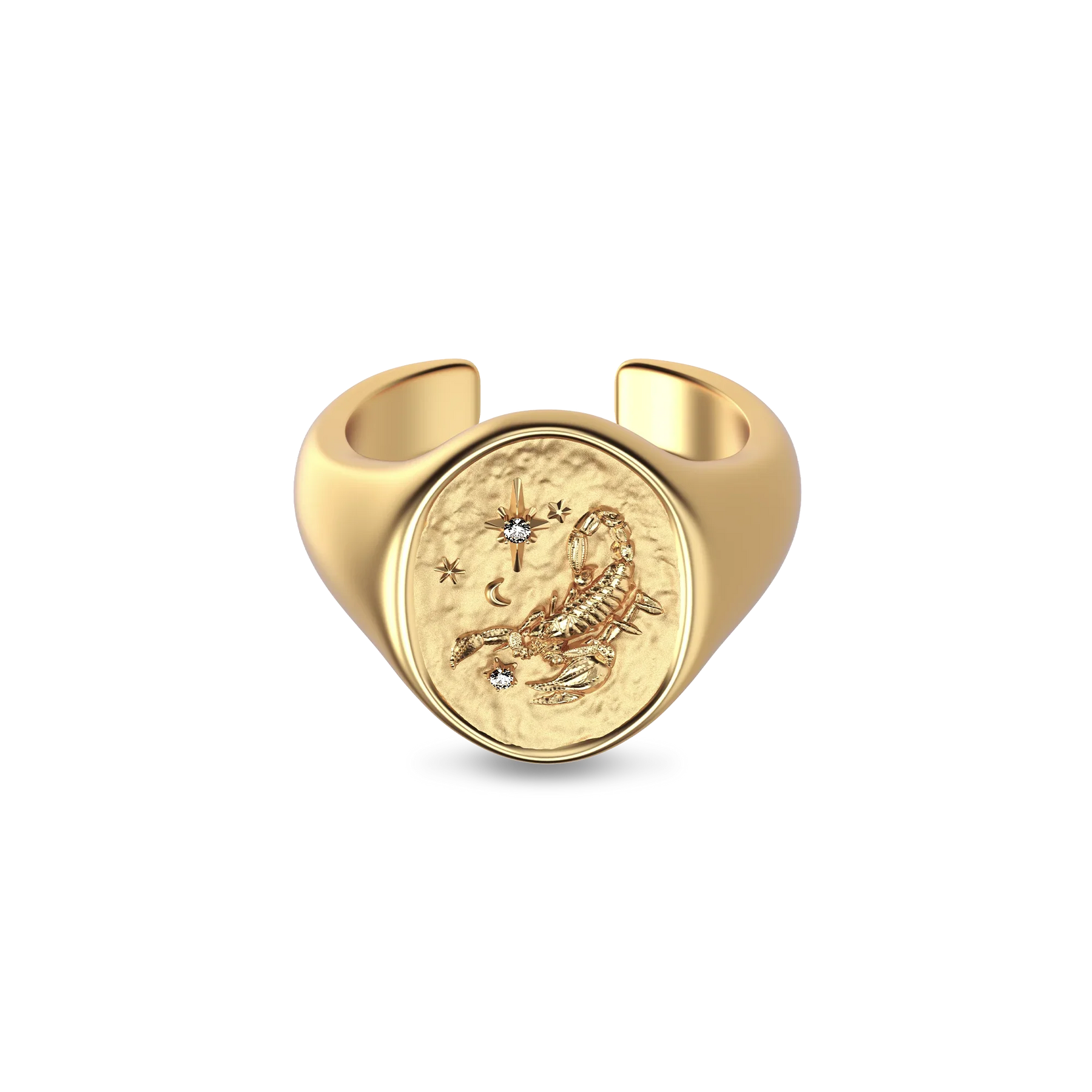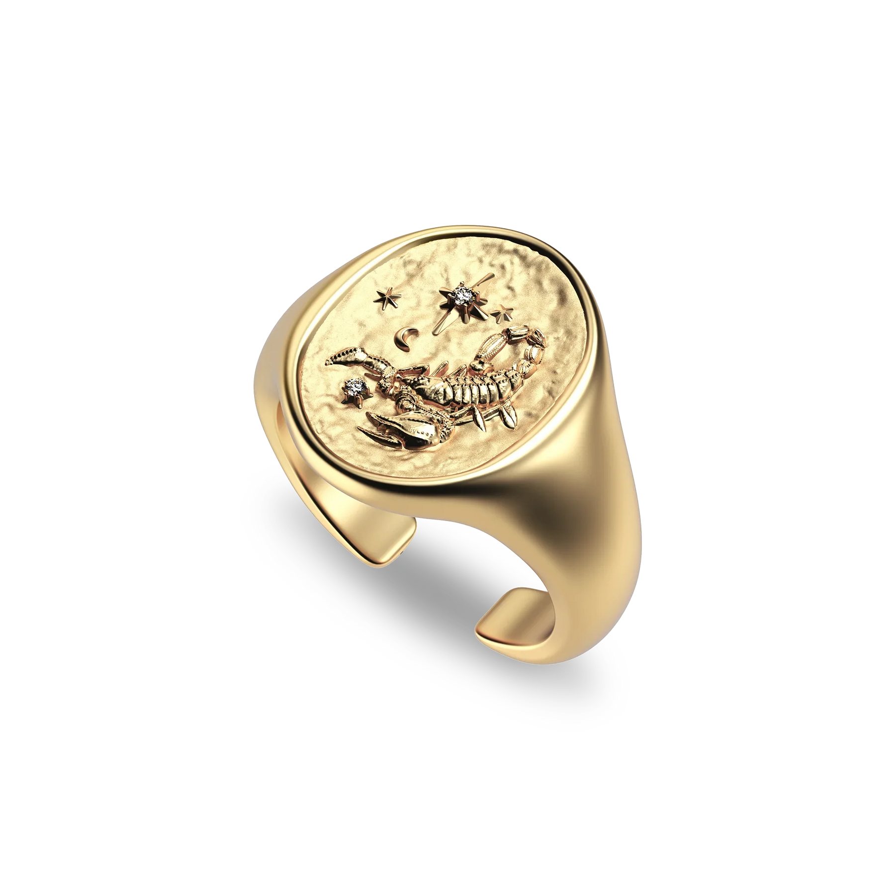 Os anéis são adornados com dois acentos de diamante, cada um definido em garras em forma de estrela, adicionando um toque celestial ao design. Os anéis são abertos nas extremidades, garantindo um ajuste versátil com quatro tamanhos diferentes disponíveis. Os símbolos do zodíaco são trabalhados em relevo, lembrando as gravações de moedas vintage, adicionando uma qualidade elegante e intemporal a cada peça. Perfeitos para expressar a sua individualidade e conexão com o cosmos, a nossa Coleção Zodíaco é indispensável para quem procura adicionar um toque de elegância celestial à sua coleção de joias.