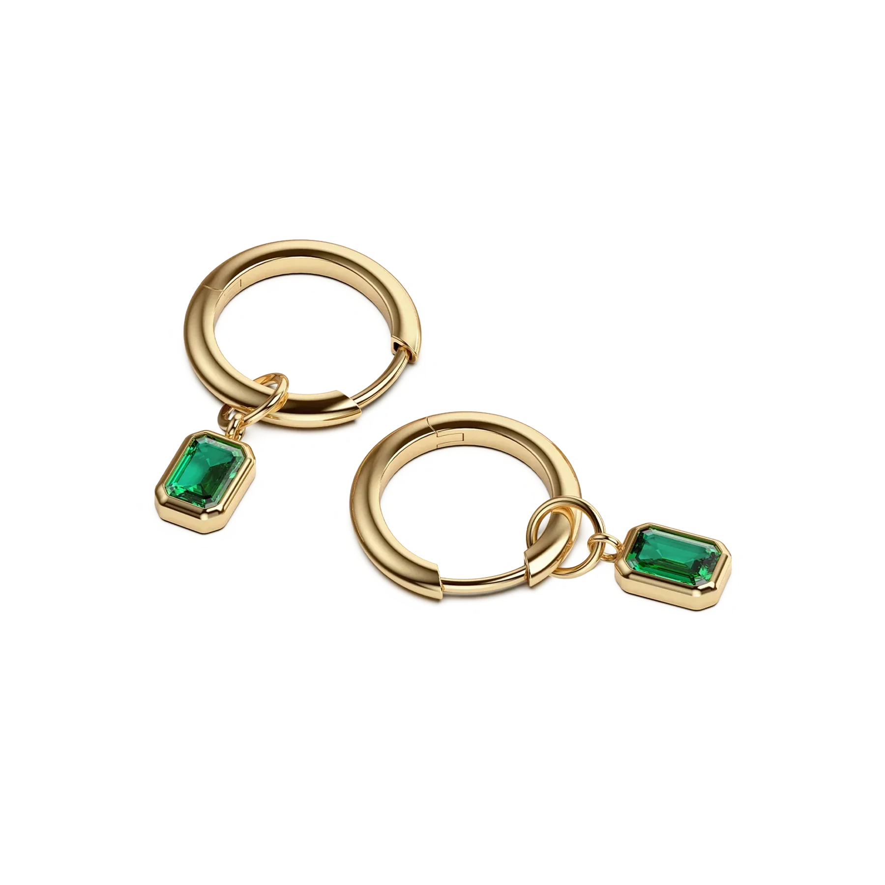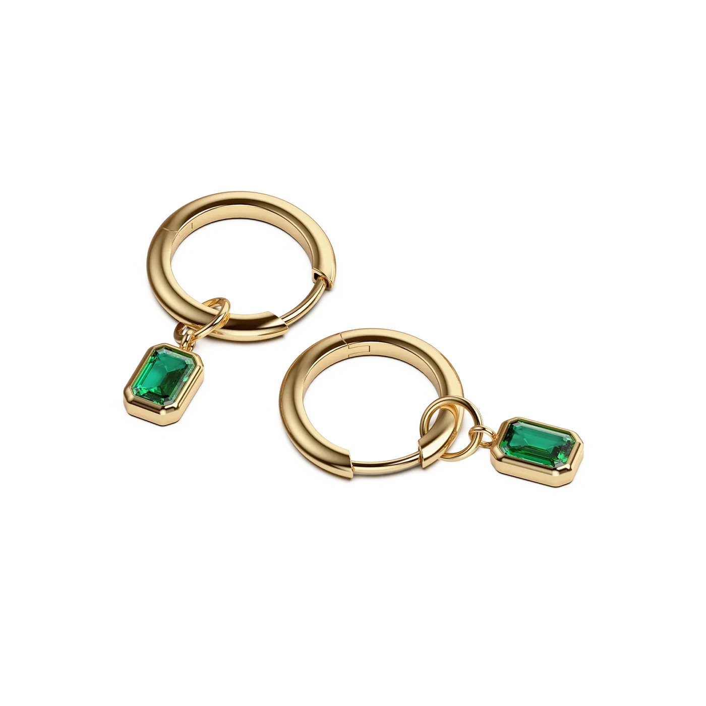 De matchande polerade hoops-örhängena är lätta, trendiga och mångsidiga, tillgängliga i tre storlekar för olika tillfällen. Handgjorda i 18K guld vermeil, har hoopsen en klicklåsning för komfort och säkerhet. För en personlig touch ingår i setet en Gold Hoop Charm med en smaragdslipad ädelsten på 4 mm x 6 mm, vilket gör att du kan byta ut berlocken för en ny look när som helst.