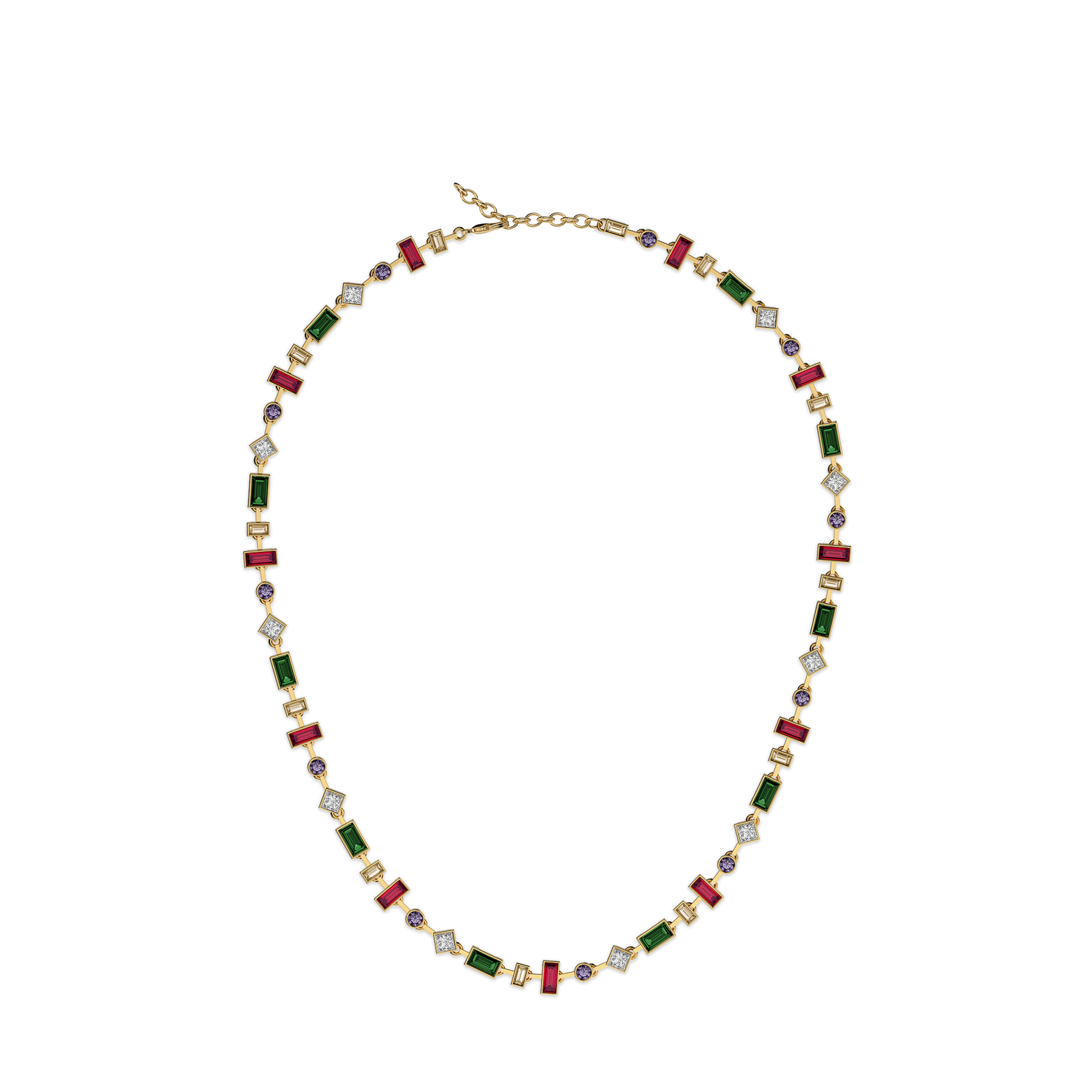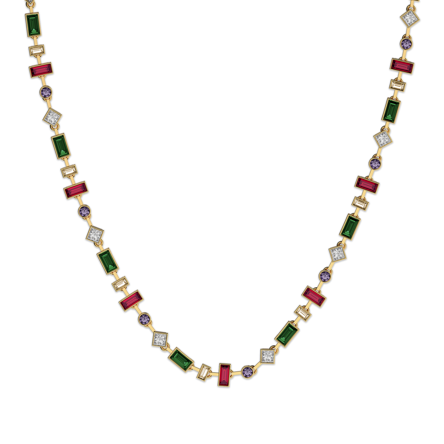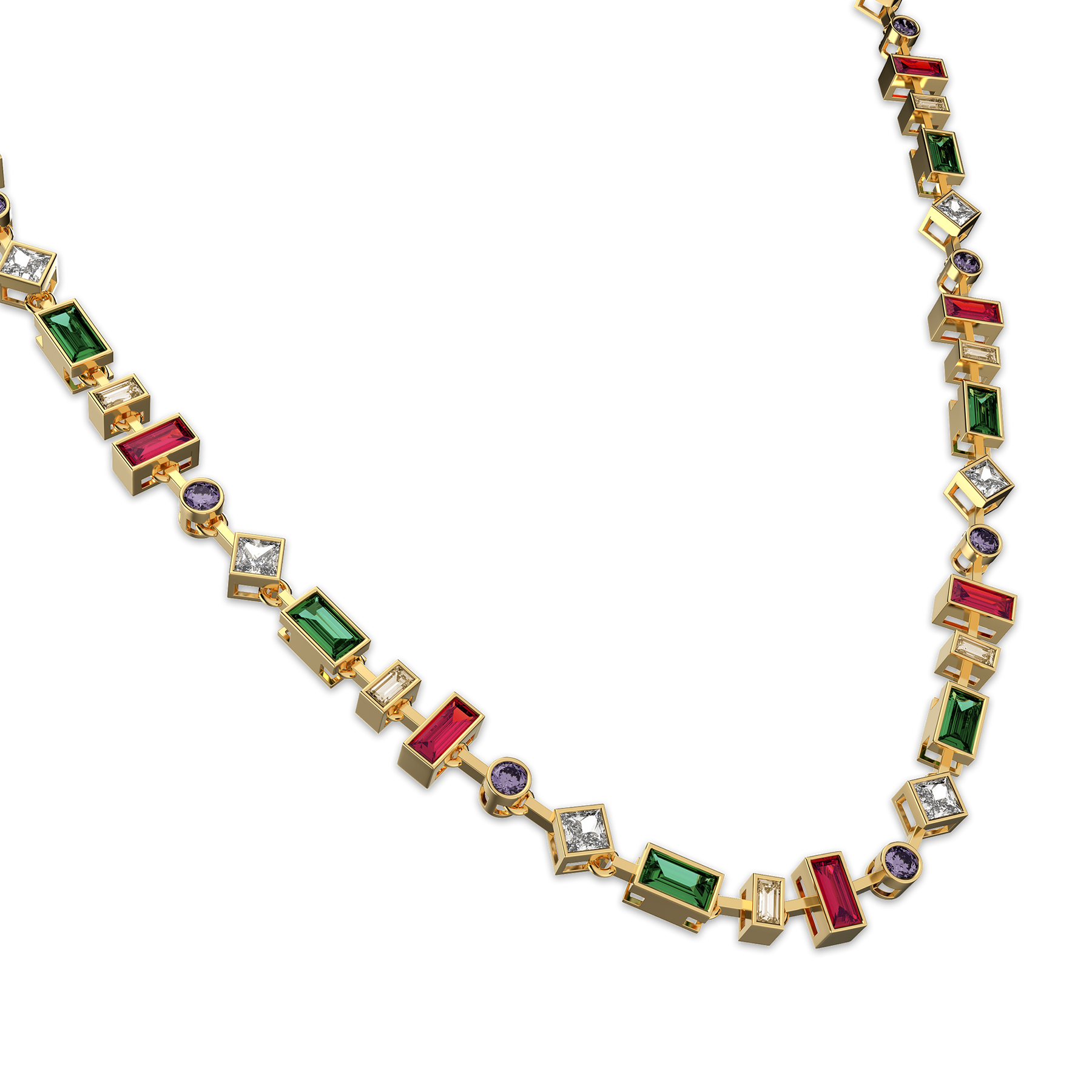 Inspirerad av den tysta precisionen hos mosaikteseraer arrangerar detta halsband flerfärgade ädelstenar i en avvägd, geometrisk rytm. Smaragdgröna och djupröda rektangulära stenar alternerar med klara, skarpa accenter och små violetta runda stenar – varje "platta" hålls i en förfinad guldram, vilket skapar en färglinje som känns sammansatt snarare än högljudd. På avstånd ser det ut som ett smalt band av glasmålningsljus; på nära håll avslöjar varje snitt och hörn en ny glimt när det rör sig.