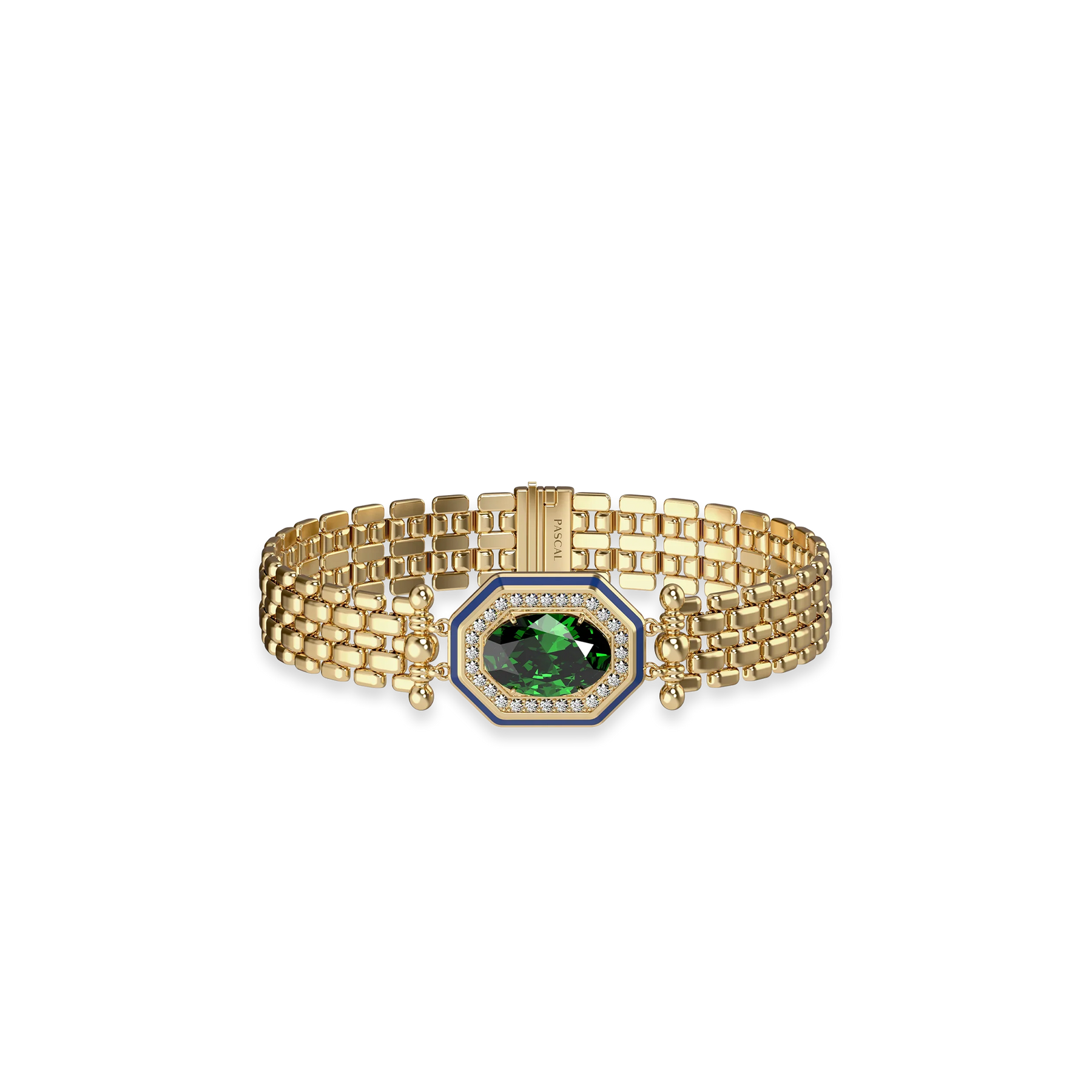 A tribute to timeless sophistication, this bracelet showcases a stunning oval-cut gemstone surrounded by shimmering lab-grown diamonds, creating a captivating halo of brilliance. Intricate enamel details further enhance its rich aesthetic, while the bracelet’s strap-like design evokes a vintage timepiece, adding a refined and regal touch.